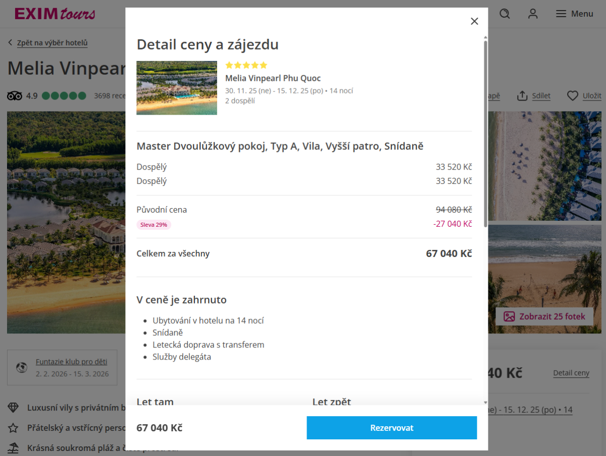 Nejlevněji nyní vychází varianta se snídaní za 33 520 Kč na osobu.