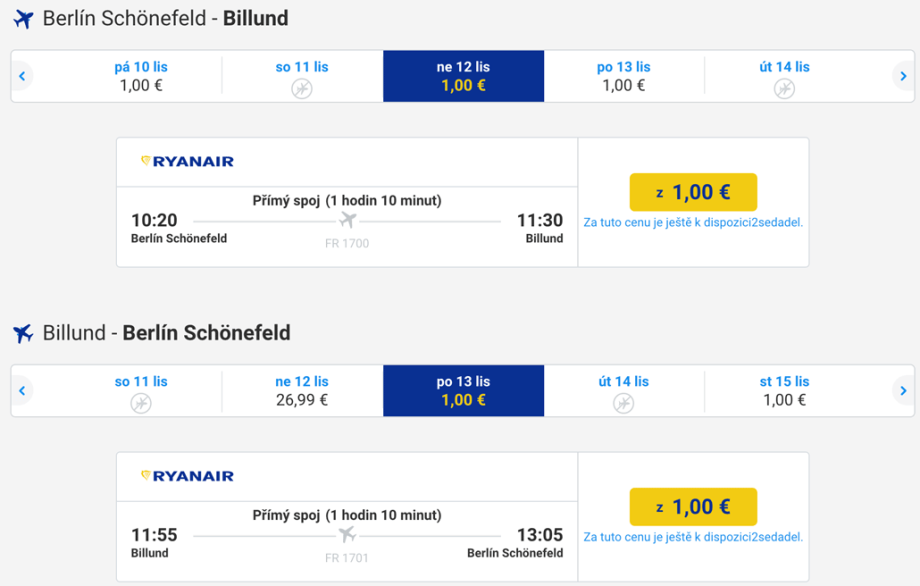 Zpáteční letenky za 2 € zakoupíte od října do prosince na většinu dostupných termínů. Dá se však předpokládat, že za pár minut už může být rozebráno. Rezervujte proto co nejrychleji.