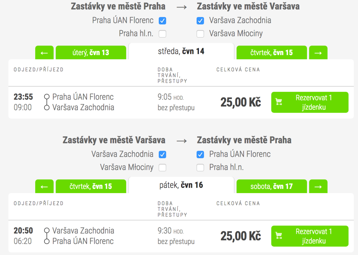 - Plzeň - Praha - Ml. Boleslav - Liberec - Zhořelec - Vratislav - Lodž - Varšava (1x denně)