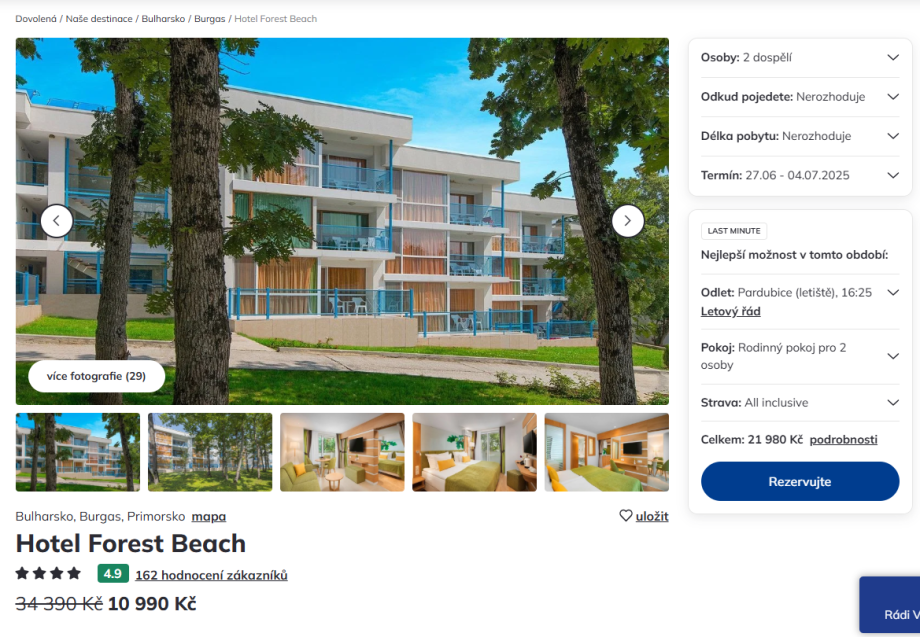- Hotel Forest Beach v termínu od 27. června do 4. července za 10 990 Kč. Let zajišťuje letecká společnost Electra Airways. Hotel je jen kousek od široké písčité pláže a zároveň blízko centra Primorska.