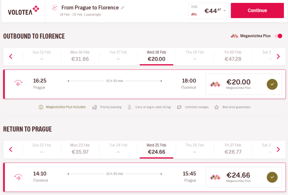 Megavolotea ceny: Při nákupu letenek zvolte ceny se členstvím Megavolotea, které následně v administraci u aerolinky ihned zrušíte. Členství se pro tuzemské cestovatele nevyplatí, ale aerolinka umožňuje nákup na 15 dní na zkoušku. Letenky za nižší cenu vám zůstanou, ale další benefity se zruší.