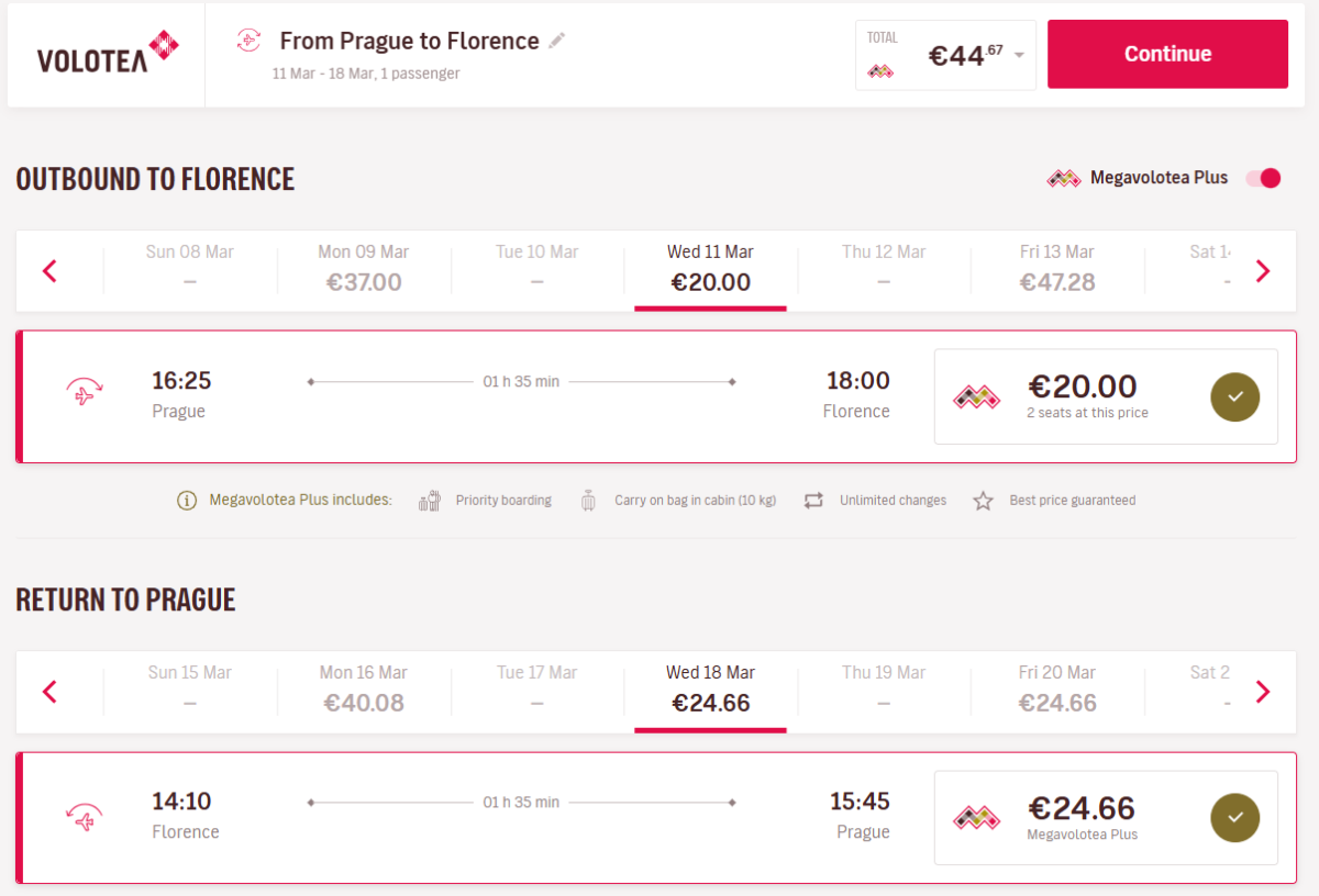 Megavolotea ceny: Při nákupu letenek zvolte ceny se členstvím Megavolotea, které následně v administraci u aerolinky ihned zrušíte. Členství se pro tuzemské cestovatele nevyplatí, ale aerolinka umožňuje nákup na 15 dní na zkoušku. Letenky za nižší cenu vám zůstanou, ale další benefity se zruší.