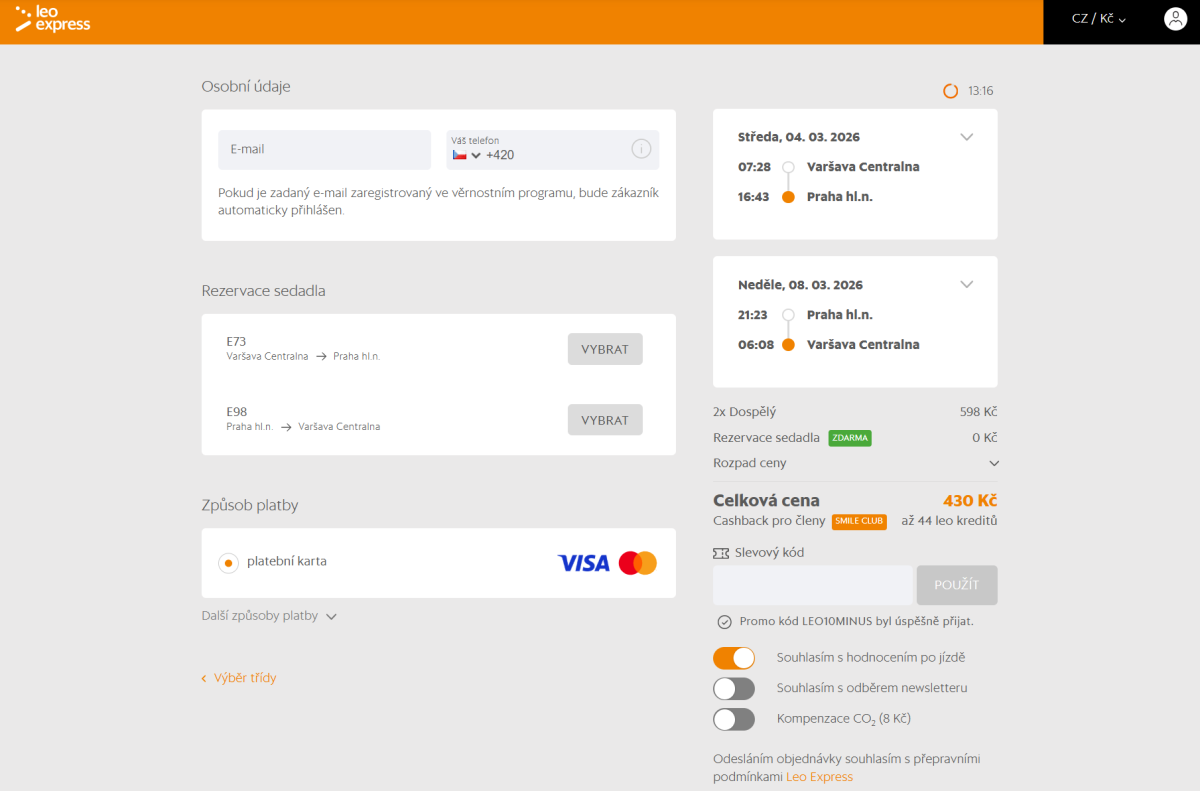 Promo jízdenky jsou nyní k dispozici již od 478 Kč. Na tuto linku lze uplatnit slevový kód LEO10MINUS, a celková cena se tak sníží na pouhých 430 Kč.