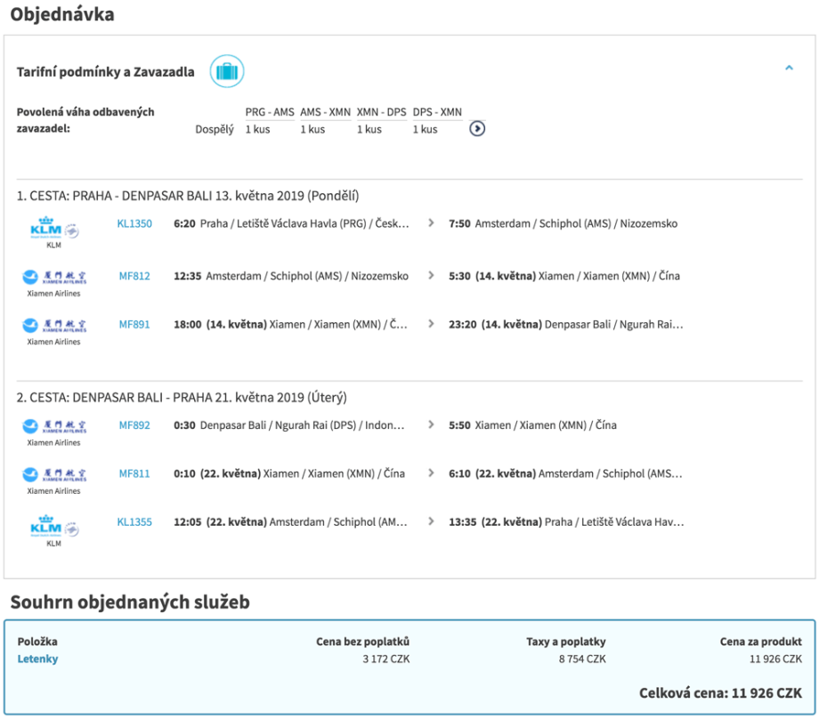 Itinerář letů zahrnuje vždy delší přestup v čínském Sia–menu, který využijte buďto aktivně k návštěvě města, nebo odpočinkově v hotelu, který dostanete od aerolinek při přestupu nad 6 hodin zdarma. Pokud nevyužijete hotel, máte nárok na letištní salónek, kde kromě občerstvení budou i sprchy, což se hodí po prohlídce města. O tom, jak vše funguje se dočtete v komentářích u aerolinií Xiamen Air.