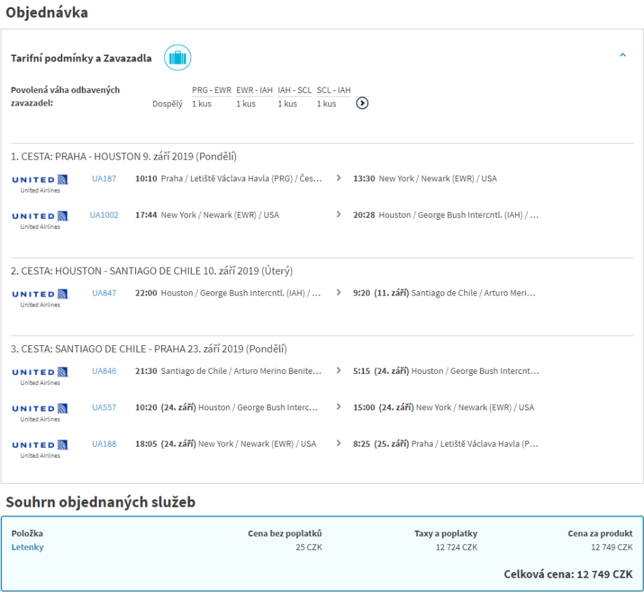 Letenky musíte rezervovat jako multicity "Praha – Houston – Santiago de Chile – Praha", například v následujících termínech: