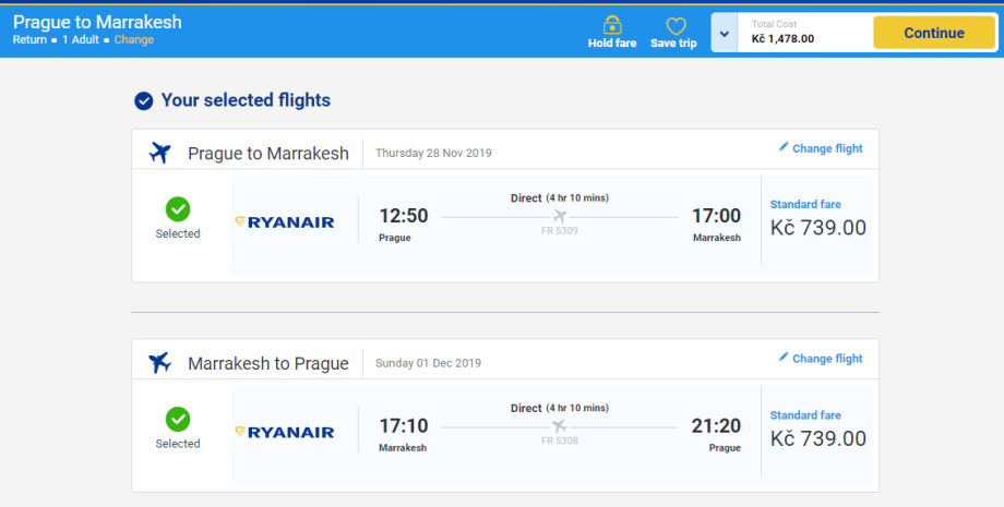 V průběhu první poloviny prosince můžete po čase pořídit levné letenky s Ryanairem na přímé lince z Prahy do města Marrákeš. Zpáteční letenky na jedno z nejvhodnějších období pro turistiku, kdy očekávejte teploty kolem 20 °C a většinově slunečno, aktuálně pořídíte od 1 478 Kč do 1 657 Kč. K dispozici jsou termíny od neděle do čtvrtka a také jeden prodloužený víkend od čtvrtka do neděle na přelomu listopadu a prosince. Zvolit samozřejmě můžete i delší termíny dle vašeho gusta.