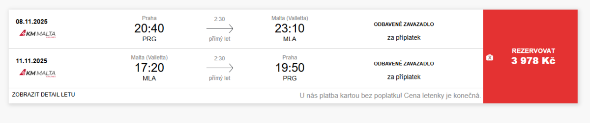 Zpáteční letenky z Prahy na Maltu pořídíte v období od listopadu do března za 3 978 Kč. Lety provozuje KM Malta Airlines – jediná aerolinka, která aktuálně nabízí přímé spojení z Prahy na Maltu.