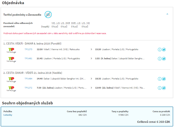Dobrodružnější cestovatele, kteří ale nepohrdnou pár dny pohodové plážové dovolené, láká k cestě do Afriky portugalská společnost TAP z Vídně. Letenky do senegalského hlavního města Dakaru na zimní sezónu, kdy vás čekají teploty okolo 25 stupňů, pořídíte za okolo 6.500 Kč a jsou vhodné pro ty, kterým nedělá problém se zabalit do 8 kg příručního zavazadla. Dokoupení odbaveného kufru totiž stojí 200 € (skutečně dvě stě) jedním směrem a v takovém případě se již letenky nevyplatí – je lepší koupit tarif již se zavazadlem v ceně, a to za 7.572 Kč, zakoupíte jej pouze na flytap.com.