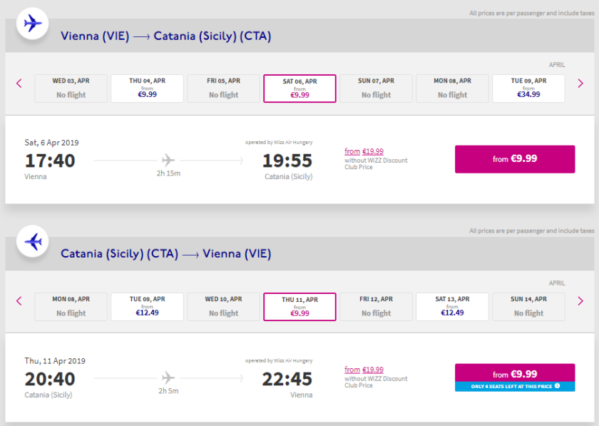 Nejlevnější letenky seženete z Vídně do Catanie na nové lince Wizz Airu od ledna až do začátku dubna na mnoho termínů. Budou vás stát 40 € / 1.025 Kč, členové WDC pak poletí dokonce jen za 20 € / 520 Kč! Cestujete-li ve dvou, členství se vyplatí přikoupit už při první cestě. Pro dvě osoby stojí 800 Kč + 2x520 Kč za zpáteční letenku, čímž se dostáváte na finální cenu 920 Kč za jednu letenku, tedy o stovku méně než bez členství. Slevu na všechny lety s Wizz Air pak budete mít ještě celých 12 následujících měsíců.