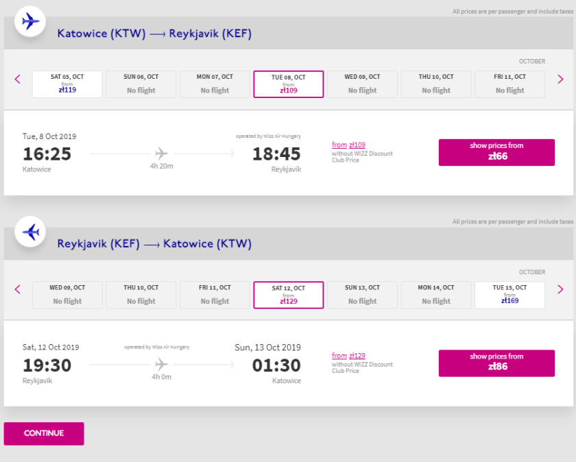 Nejlevnější letenky aktuálně pořídíte z polských Katovic na dva říjnové a jeden listopadový termín za 152 PLN při členství v klubu WDC. Letíte-li ve dvou osobách a členy klubu nejste, vyplatí se ho pořídit už při první cestě, kdy celkem za obě letenky zaplatíte 443 zlotých oproti 476 PLN bez členství.