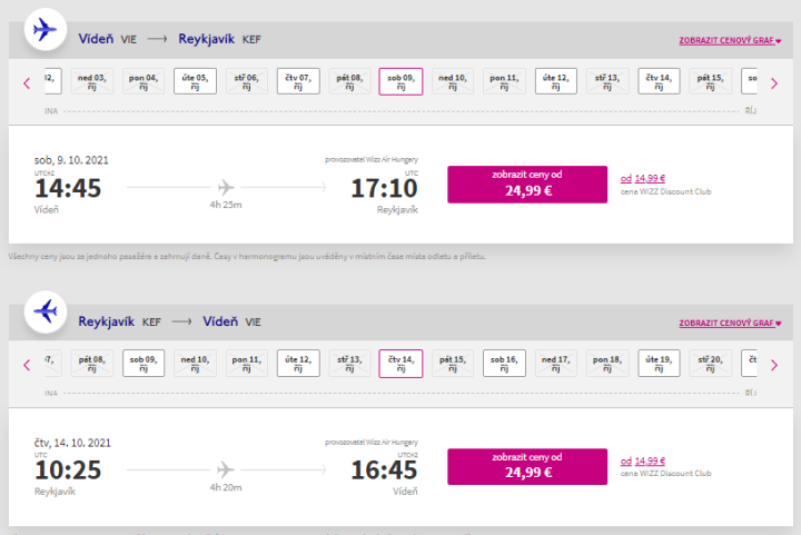 Zpáteční letenky z Vídně na Island pořídíte za 50 EUR, členové klubu WDC zaplatí dokonce jen 30 EURČlenství se rozhodně vyplatí zakoupit při cestě minimálně 2 osob zvlášť pokud potřebujete větší příruční nebo odbavené zavazadlo, které není v základní ceně letenky.