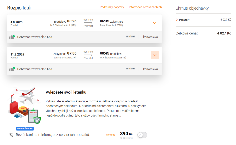 Konkrétní termíny najdete v kalendáři letů. Ceny v přehledu se mohou lišit, ale při přechodu k samotnému nákupu je konečná částka vždy 4 026 Kč.