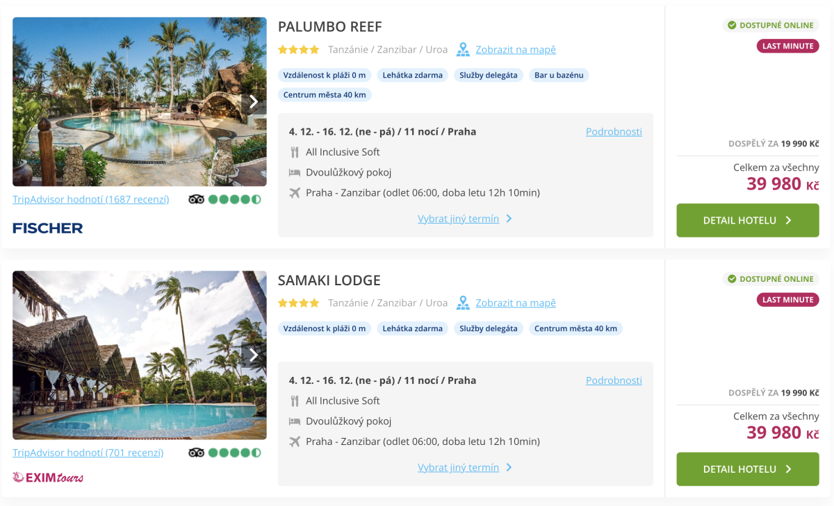 Krom letos tradičních zájezdů s přímými lety na Zanzibar s Čedokem, lze vybrat také neméně zajímavé termíny u dalších CK. Příkladem je nabídka cestovní kanceláře Fischer, která nabízí 11 nocí s all-inclusive za cenu 17 990 Kč.