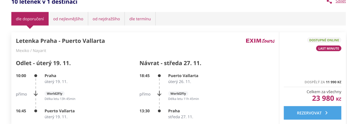 Letí se do Puerto Vallarta a d dispozici je týdenní termín od 19. do 27. listopadu. Zajímavou cenu získáte i za let přes Vánoce od 17. do 28. prosince za 19 990 Kč nebo přes Silvestra od 27. prosince do 8. ledna.