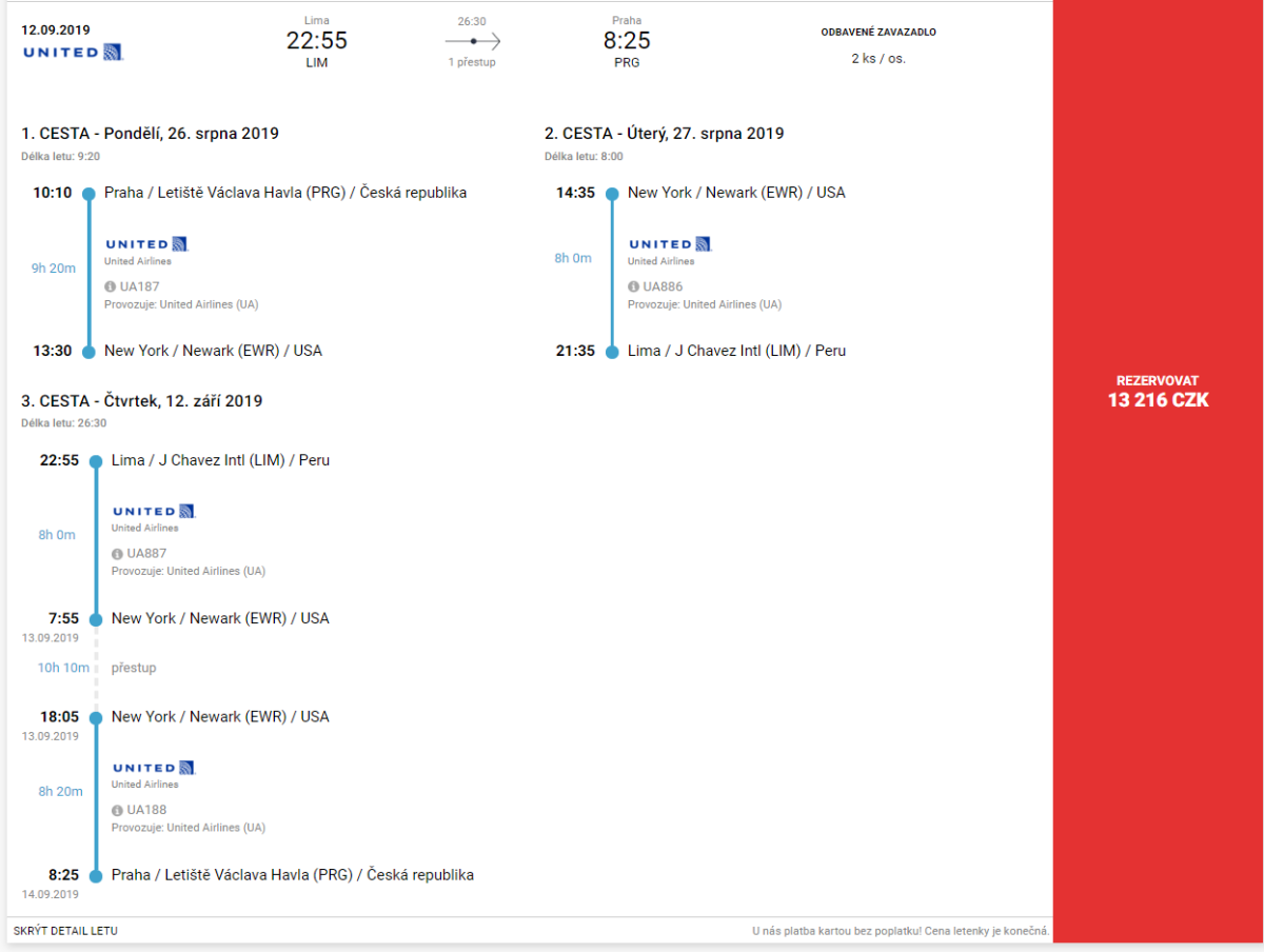 Letenky je nutné rezervovat jako multi-city Praha – New York – Lima – Praha, viz příklady termínů: