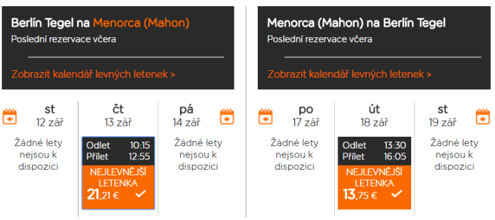 Nejlevnější letenky seženete přes easyJet z berlínského letiště Tegel, a to v několika cenových relacích do 1.400 Kč na tři zářijové termíny: