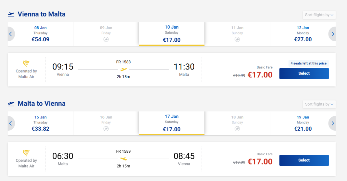 Zpáteční letenky z Vídně na Maltu nyní pořídíte u Ryanairu nejlevněji v těchto termínech: