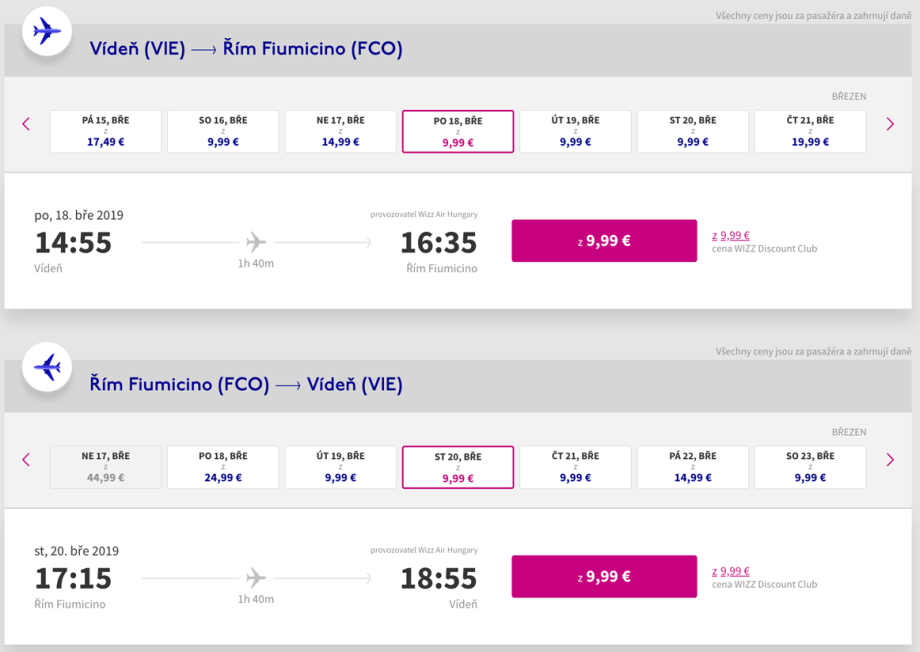 Na spoustu termínů aktuálně najdete zpáteční letenky z Vídně do Říma s aeroliniemi Wizz Air za 20 eur. Cena 10 € za let se objevuje oběma směry převážně ve všední dny, a to i pro nečleny Wizz Discount klubu.