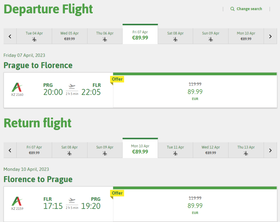 Pokud byste ale například do Florencie rádi vyrazili na Velikonoce, cenu zpáteční letenky za 180 EUR bychom už označili za solidní.