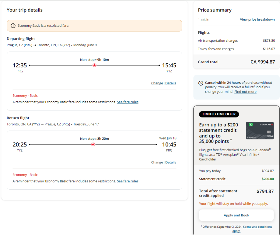Air Canada již spustila prodej letenek na svém webu aircanada.com. Zpáteční let z Prahy do Toronta se aktuálně prodává za 995 CAD, tedy zhruba 17 000 Kč.