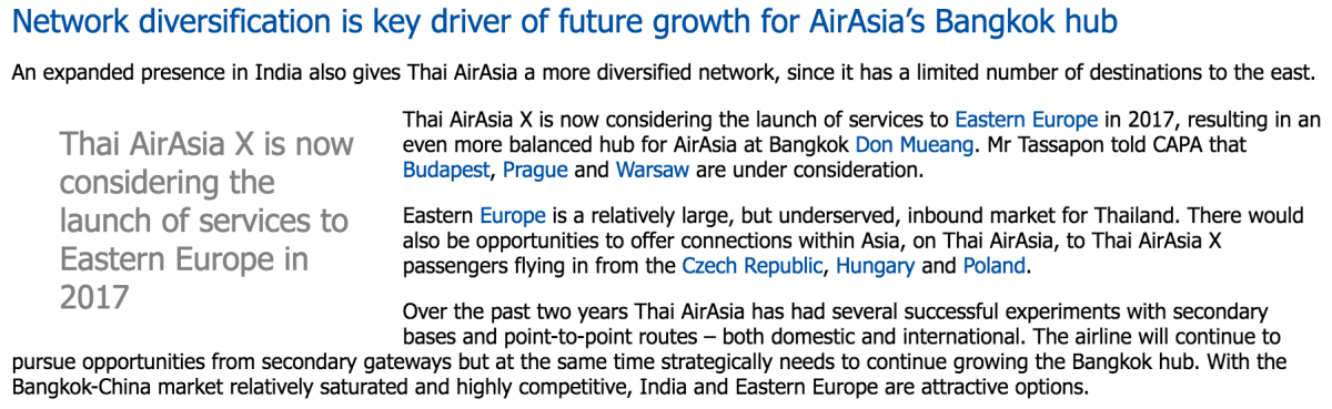 Z čeho jsme si před 3 lety ustřelovali na Apríla, se možná v příštím roce stane skutečností. Thajská pobočka nejlepší nízkonákladové aerolinky na světě Thai AirAsia X zvažuje zahájení provozu dálkové linky do "východní Evropy". Dle slov člena představenstva pana Tassapona připadá v úvahu Praha, Budapešť nebo Varšava. Létat by se přitom mělo začít již v roce 2017!