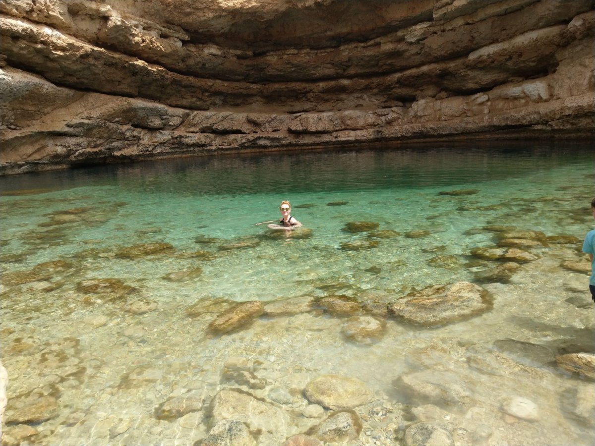 Když zadáte do Google slovo Omán, jedno z míst, které na vás vyskočí jako první je Sinkhole - díra v zemi, která je z části zaplněna slanou vodou. Dneska se tedy vydáváme zjistit, jestli je opravdu slaná a taky se vykoupat, protože nám počasí přeje a je tu stále krásně. Přijíždíme k bráně a hned nás vítají kozy. Pozor! Hlavně je nekrmte, nebo vás seřve místní hlídač jako mě. :D A to jsem jí chtěla dopřát jednu jahodu.