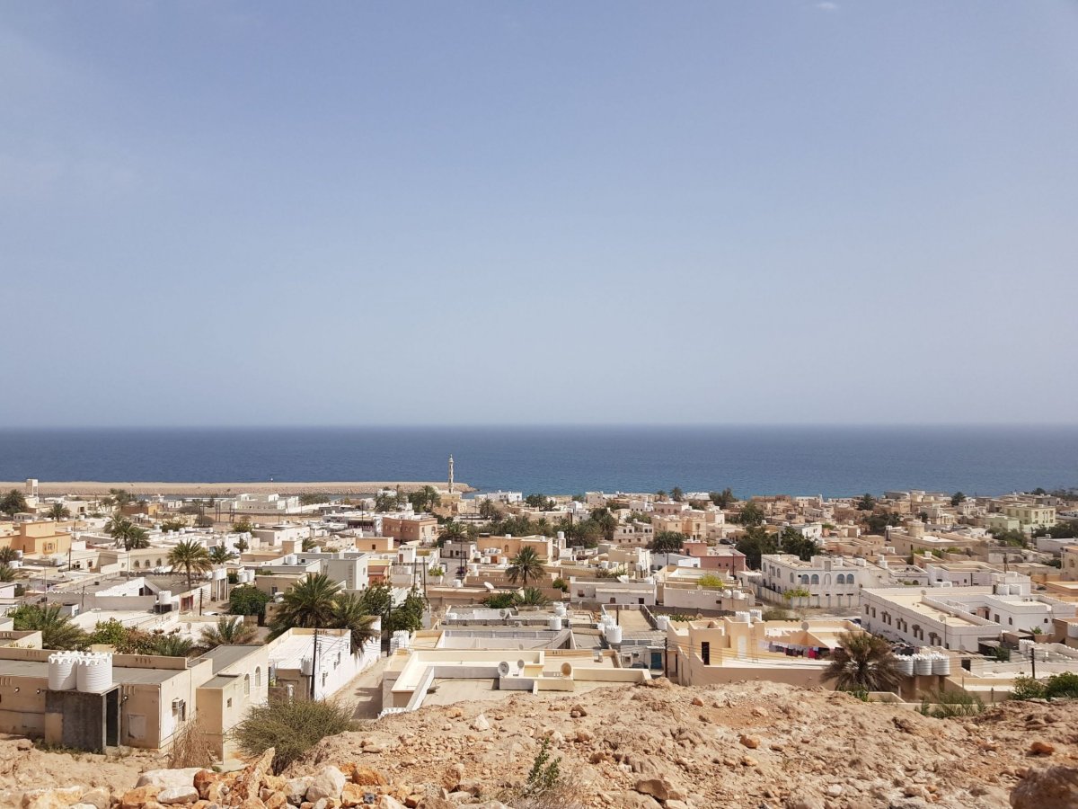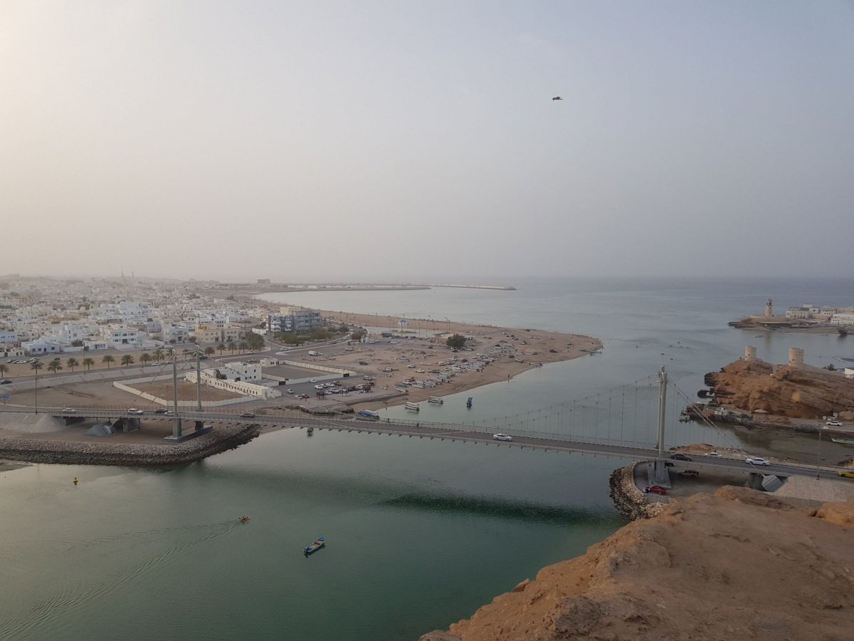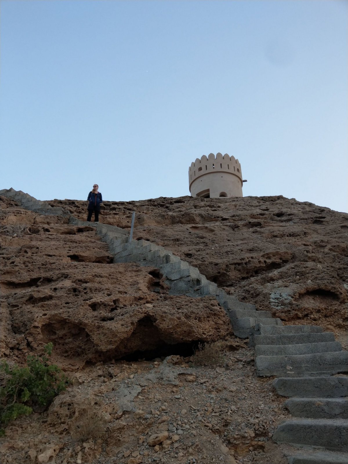 Na tomhle místě bych byla klidně celý den, voda je průzračná, mini rybky zkoušejí, jestli nejste náhodou nějaká potrava a uždibují snad z každého kousku těla, který máte pod vodou. Protože tady není žádná pláž, na celý den to není, ale hodinku tady určitě vydrží každý. Vzhledem k tomu, že je Sinkhole v oploceném areálu, dá se tady i posedět, ale zatím zde není restaurace ani obchůdek s občerstvením, tak se přesouváme dál. Po cestě natrefíme na White sandy beach. Pláž zase nic moc, jsou tu i nějaké odpadky…. Takže se koupání nekoná a jedeme do dnešní cílové stanice, přístavního města SUR. Navštěvujeme mini muzeum lodí. I když vlastně ani nevíme, jestli to muzeum je, protože vcházíme bránou, která je pootevřená, ale nikdo tady není. A když nikdo, ani hlídač, tak co? :) Pak se jdeme podívat na západ slunce k věži Al Ayjah watch tower. Chvilku nevíme kde zaparkovat, ale jakmile zjistíme, že je pod věží hotel, neváháme a parkujeme tady. Výstup na horu je sice takový krkolomný, ale s pevnou obuví jsme nahoře raz dva. A ty výhledy? No posuďte sami.