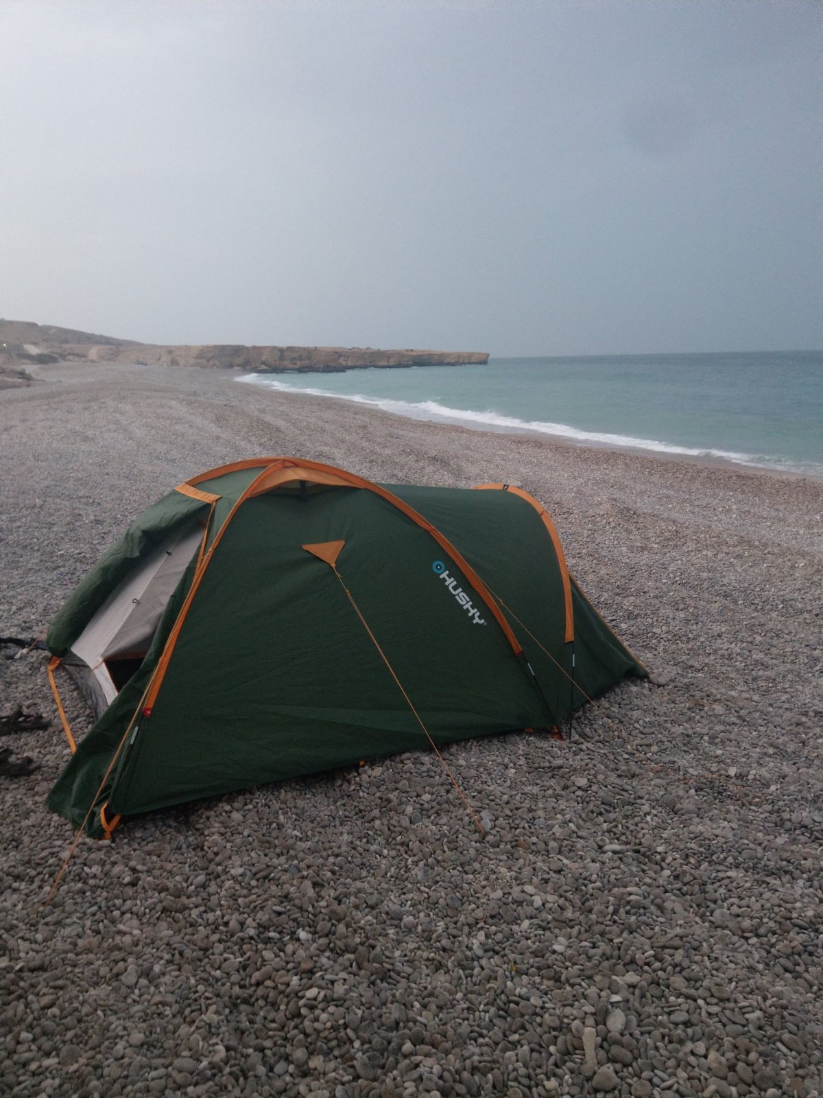Dneska máme v plánu stanovat, takže si dáváme volnější den a hledáme nějakou krásnou pláž, protože jsme doteď neměli štěstí. Po ceste si na mapě všimneme Wadi Shab. Opět turistická atrakce bez turistů a určitě zajímavé pro trekking. Na konci procházky vás čeká vodopád, údolí plné vody a koupání - nebo to minimálně píšou na Trip Advisoru. Protože bylo na konci března už skoro po sezóně a nebylo tady moc vody, tak se po 20 minutách jízdy autem vracíme zpět. Děláme dobře, protože zde úplnou náhodou najdeme krásnou oblázkovou pláž s neuvěřitelně čistou vodou. Musíme se sice koupat v oblečení, ale to nám tu radost z moře vůbec nekazí, naopak. V podvečer se vracíme do Muscatu nakoupit na gril a dohodneme se, že budeme stanovat na pláži, kde se nám opravdu líbilo. A teď long story short - vybrali jsme si asi nejblbější den z těch deseti, protože v podvečer začalo poměrně dost foukat a v noci i pršet... No, nevzdáváme to a rozděláváme oheň, nachystám malé zeleninové pytlíky do alobalu, vytáhneme koupené špízy a instantní gril. V malé konvičce si připravíme si čaj, prostě idylka. Teda do chvíle, než se zvedne vítr a začne tak moc foukat, že ze skály nad námi na nás začnou padat kamínky a to i na stan. Ano, stan, na který nejen, že padají kamínky, ale co chvíli musíme zapichovat kolíky zpět do země, protože vítr... Ještě, že jsme všechny nepotřebné věci nechali v autě. Po hodině a půl to vzdávám, Honza mi dává na vybranou - chce i zůstat, ale dostanu strach, že se nám něco může stát a tak hledám hotel v okolí. Nejbližší je cca 800 metrů, ale noc v něm stojí ranec... No nic, vzdávám to. Během 10 minut stihneme sbalit, uhasit oheň a vyhodit syrové jídlo… tak tohle se fakt nepovedlo. Nakonec se dohodneme, že pojedeme do Muscatu. Po cestě tedy booknu lepší hotel, ať si zlepšíme náladu a dáme si horkou sprchu. Věřte, že z nás museli mít v hotelu pěkné haló :D Dva vyuzení, špinaví a unavení evropané s igelitkama v ruce, jdou do “čtyřhvězdy” a po příjezdu si hned v restauraci dají pivo “na stojáka”. Ehm, museli jsme zaplatit vše předem, asi se jim nedivím :D