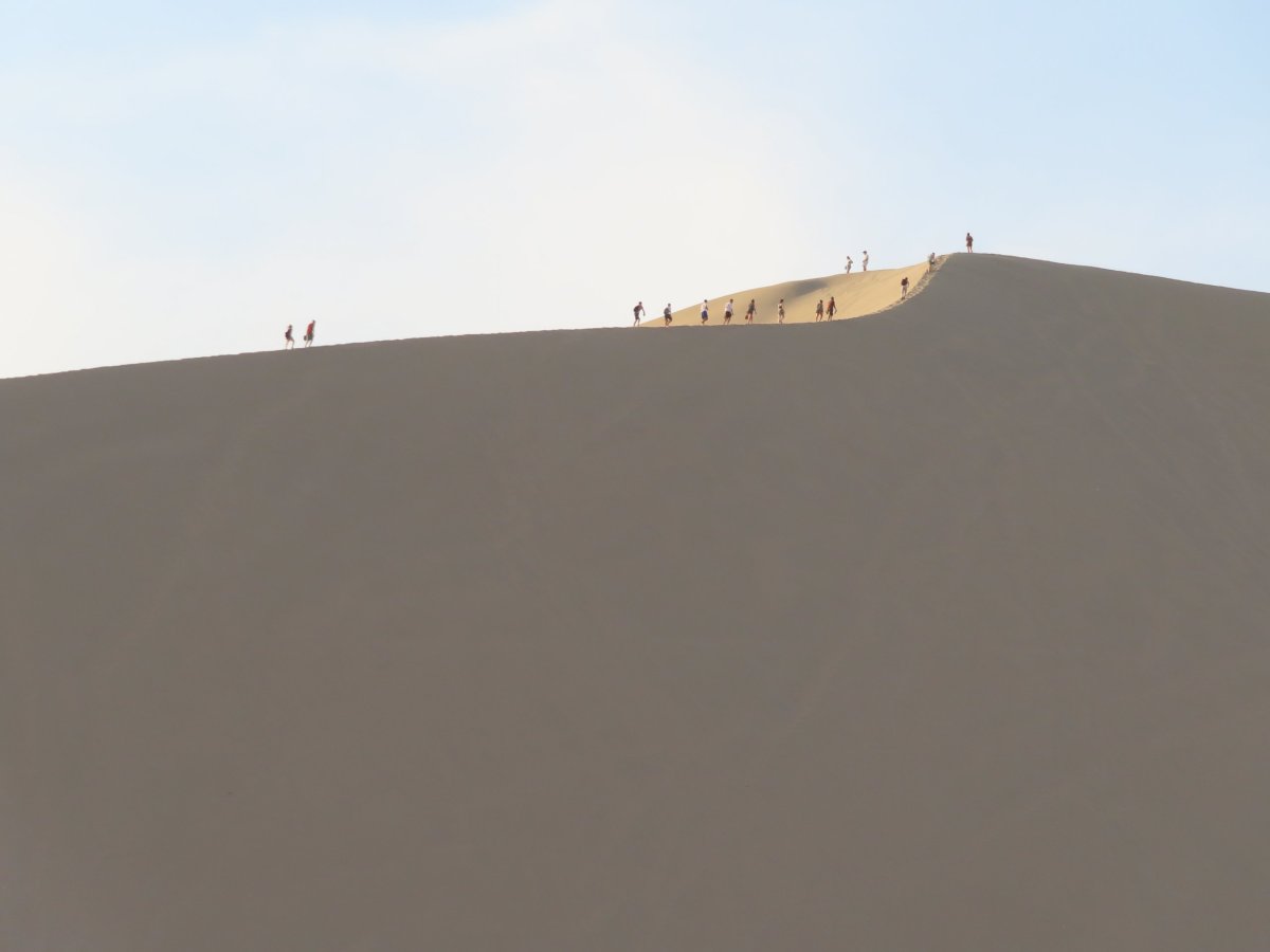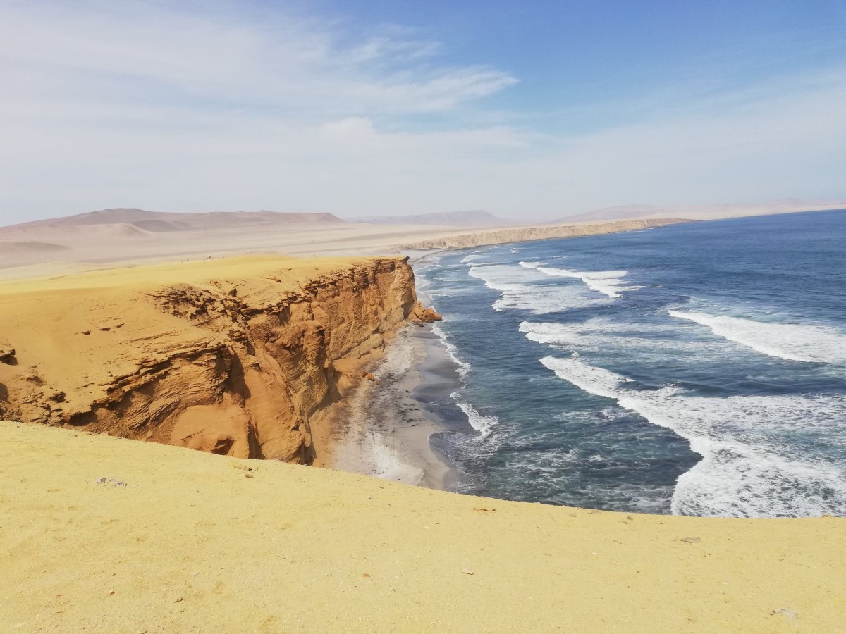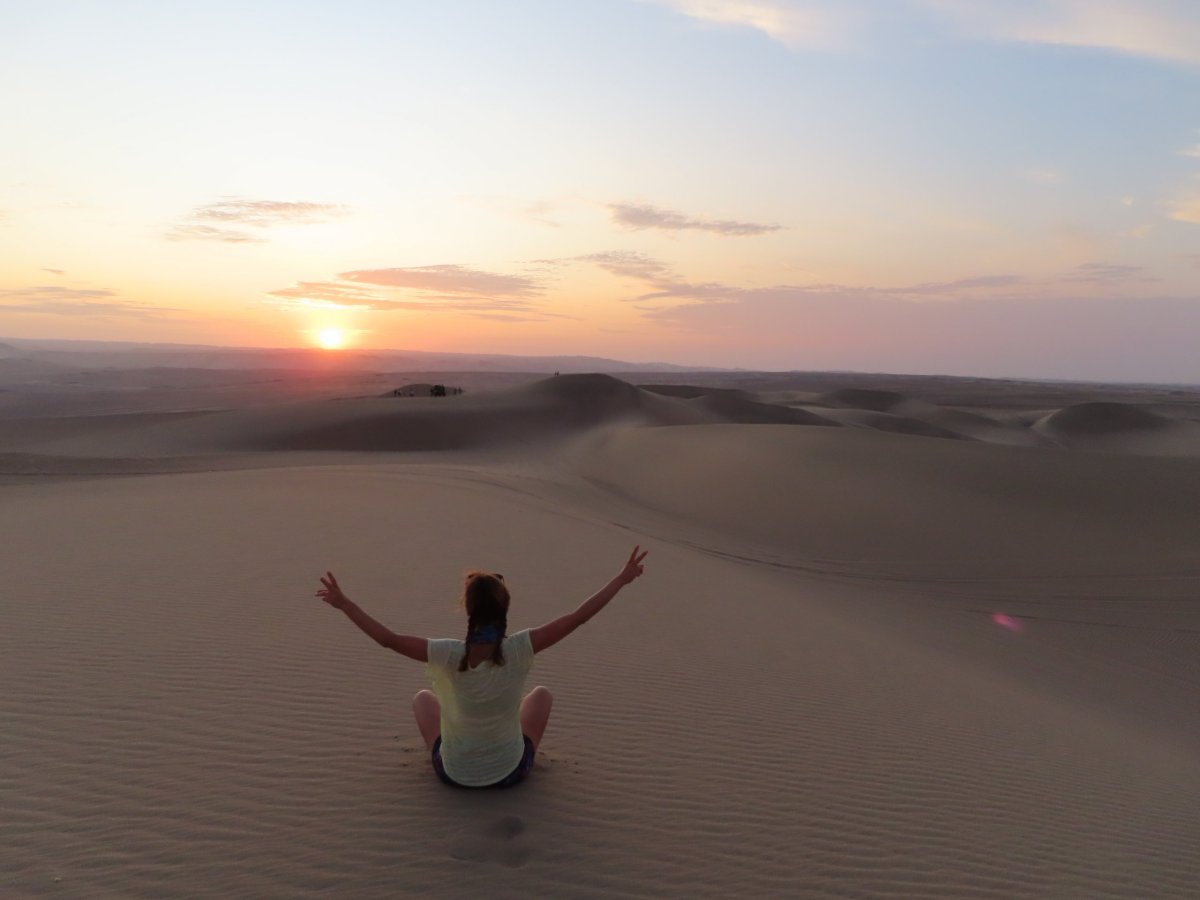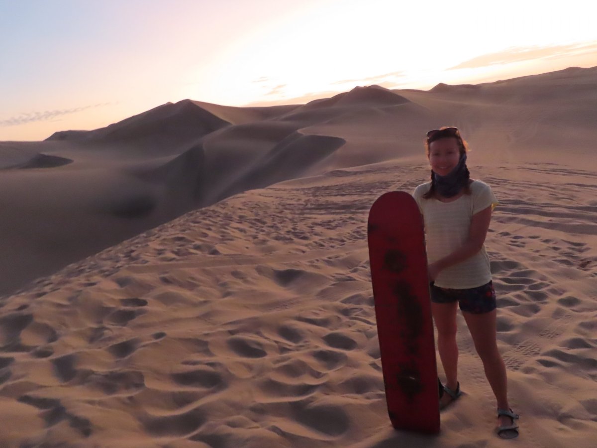 Huacachina je malá vesnice vystavěná kolem pouštní oázy a obklopená písečnými dunami. Máme zde zamluvenou projížďku po písečných dunách za západu slunce. Po nějaké době celkem bláznivé jízdy nahoru a dolů, kdy se nezřídka ozýval jekot spolucestujících, přijíždíme na jeden z vrcholů, kde si zkusíme sandboarding. Řidič vytáhne z kufru pro každého zjednodušenou verzi snowboardu, lehce navoskuje a jdeme na věc. Na prkno si leháme na břicho a držíme se vázání. Před první jízdou to zní dost bláznivě, ale jakmile si to vyzkoušíme, jsme nadšeni.