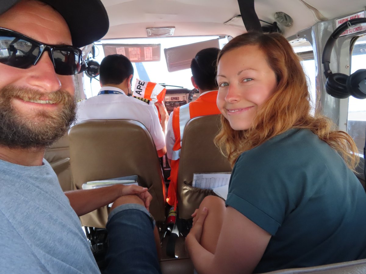 Do teď nám není jasné, jak k tomu došlo, nicméně po příjezdu na letiště se nás ujímá sympatický kopilot a vysvětluje nám, že po dobu našeho letu se o nás bude starat a že už na nás čeká SOUKROMÉ letadlo. Nespornou výhodou je to, že případné zvracení nebude před tolika lidmi. Před vzletem následuje focení a ujištění, že počasí pro let je ideální, není vítr a nebudou žádné turbulence.