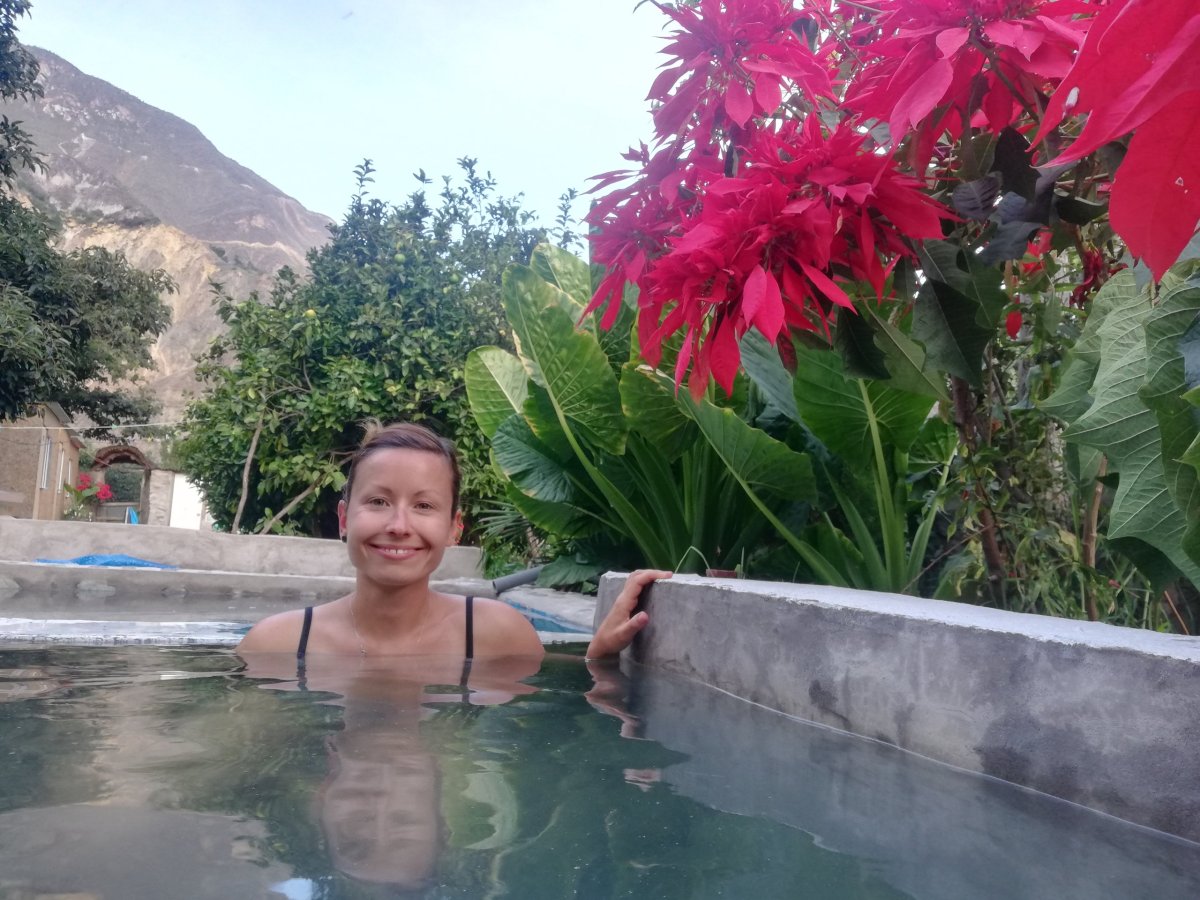 Jen poslední kilometr není úplně příjemný, neboť se pěšina napojí na širší prašnou cestu, po které projíždí překvapivě dost aut a za každým se zvedne obrovský mrak prachu. Do Llahuaru dorážíme před druhou odpoledne, zbytek dne si užíváme volna čtením v houpací síti s výhledem do kaňonu a koupáním v bazénech s teplou a studenou vodou.