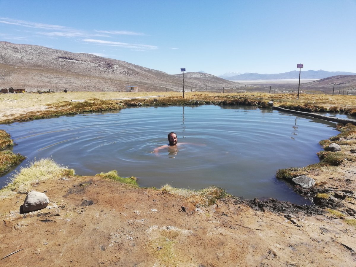 Od slaného jezera pak jedeme ještě výše do 4 600 m n. m., kde se nachází minivulkán a přilehlá termální jezírka, ve kterých je možné se vykoupat (5 PEN). Této možnosti samozřejmě využíváme. Voda má krásných 30 stupňů, ale na Markétu je to prý trochu málo.
