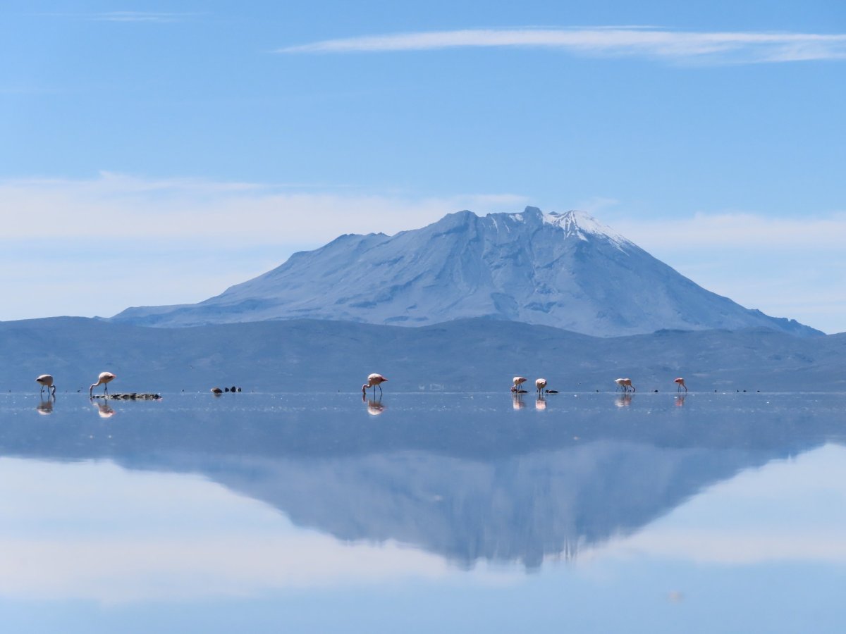 Druhý den nás čeká celodenní výlet do Reserva Nacional Salinas y Aguada Blanca. Výlet máme objednaný přes agenturu (65 PEN / os). Dodávka s průvodce a dalšími turisty nás před hotelem vyzvedává okolo 6:30 ráno a nejprve jedeme na vyhlídku na oba vulkány, kde o nich dostáváme malou přednášku. Poté jedeme asi půl hodinu do vesničky Chiguata, kde na nás čeká snídaně v podobě dvou sendvičů a čaje (6 PEN). Pak už následuje asi hodinová cesta k Laguna de Salinas, která se nachází v 4 200 m n. m. Jak už název napovídá, toto jezero je slané a v aktuálním ročním období se nachází ve fázi odpařování, což potrvá až do září, kdy zde nebude žádná voda a zbyde jen sůl. Ta se zde netěží, jelikož se jedná o chráněnou rezervaci. Na jezeře vidíme hejno plameňáků a vyschlé břehy jsou dokonale posety stopami.
