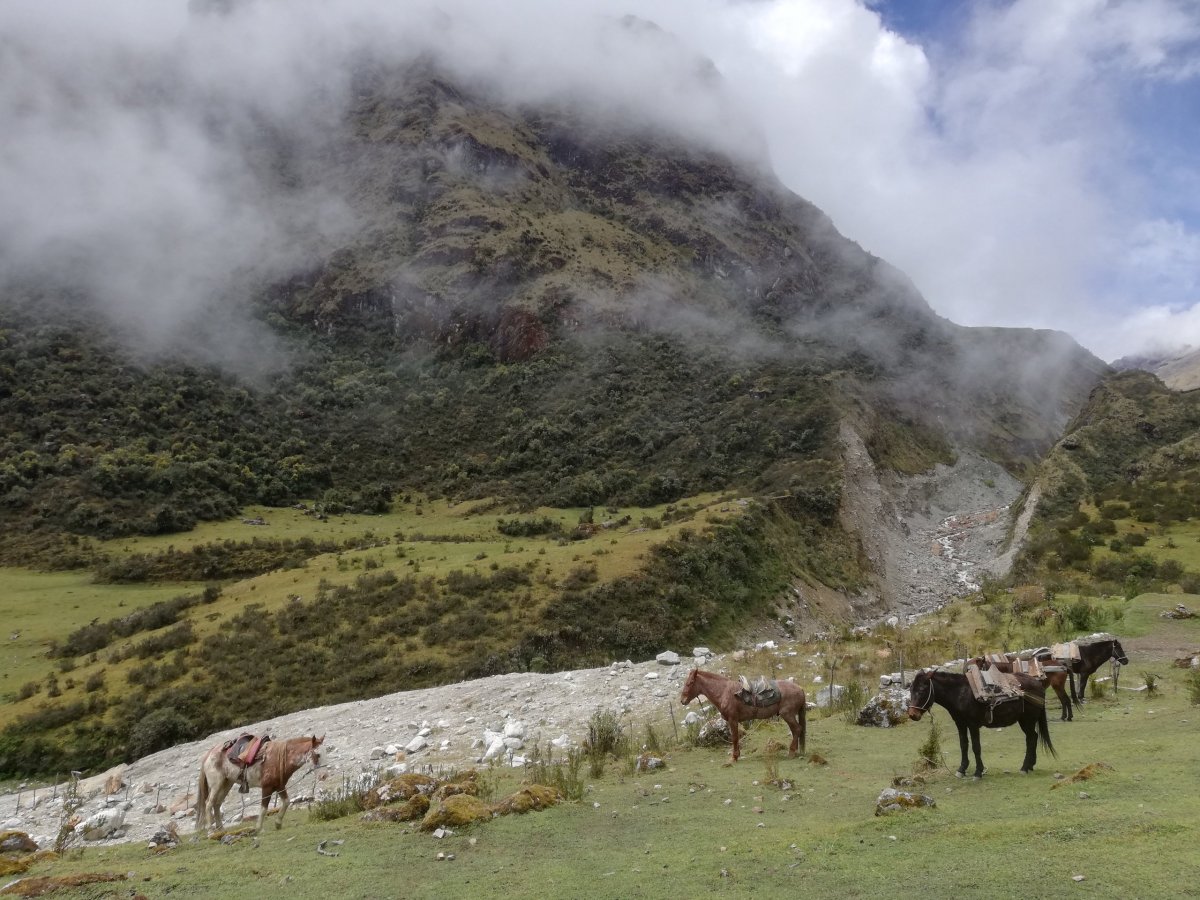 Druhý den treku je nejnáročnější částí, ale také tou nejhezčí. Vycházíme ráno v 6:30 a čeká nás stoupání kolem nádherného Nevado Salkantay (6 271 m n. m.). V podobný čas vyráží na cestu i všechny skupiny s průvodci, a tak je na trase dost rušno, každou chvíli nás předjíždí nějaká skupina na koních.