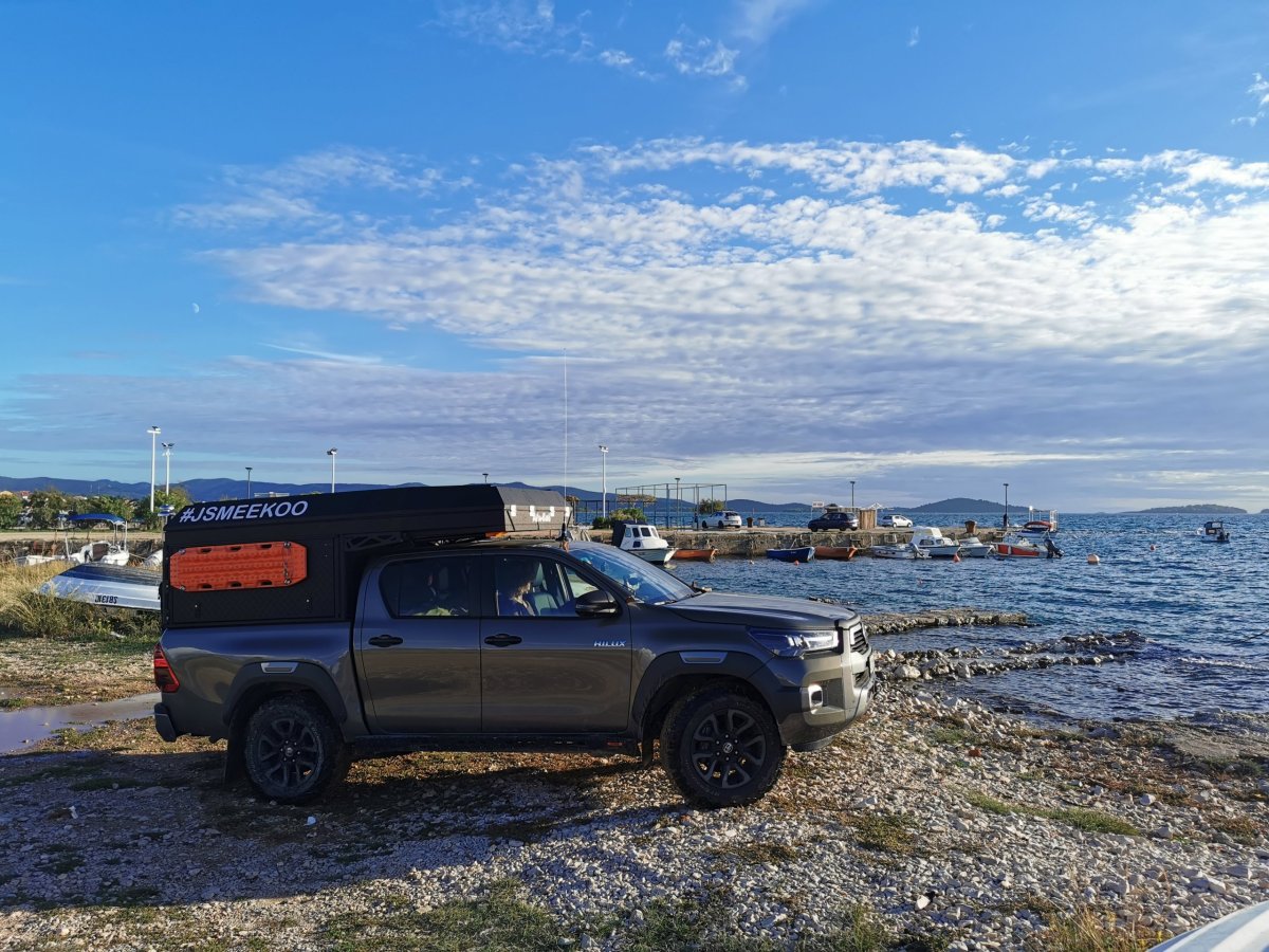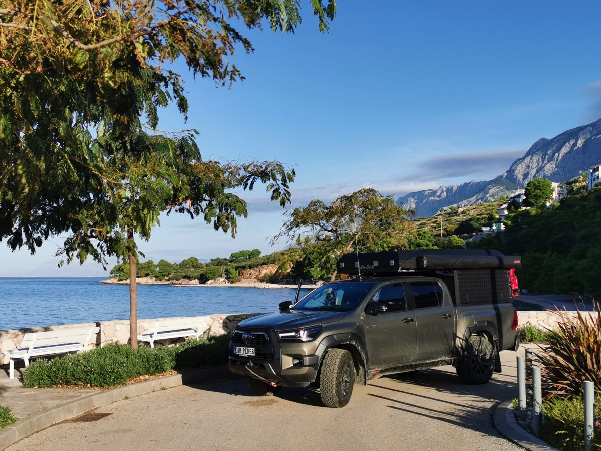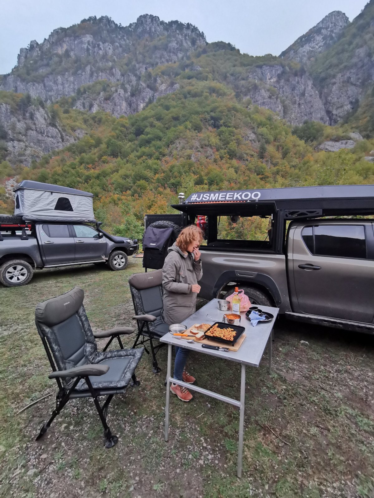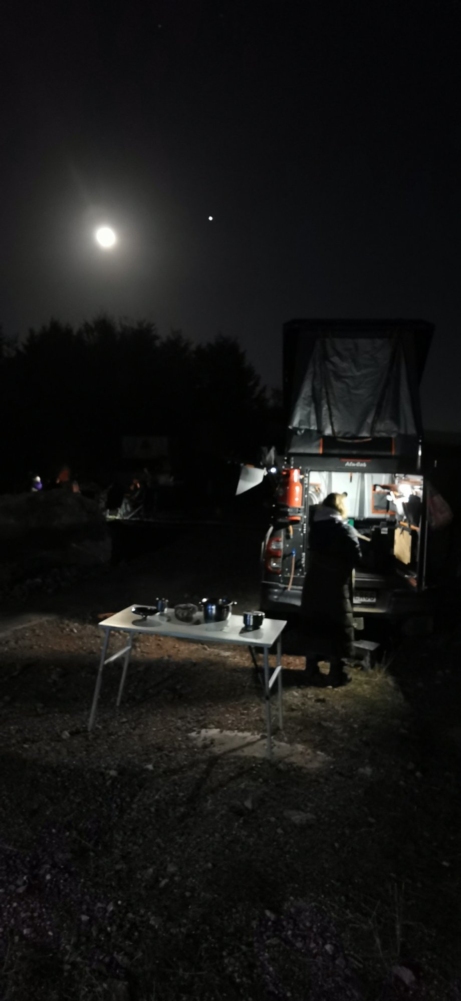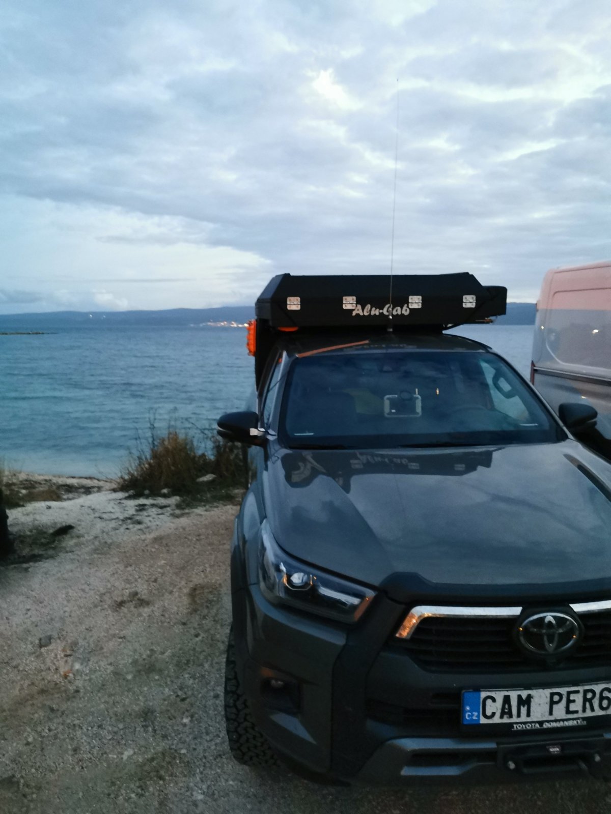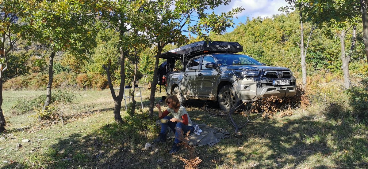Další den ráno stojí naše auto blízko Honzy, který s sebou na kávovar na 220V. Vyzkoušíme uvařit kafe na naší baterku a je to zcela bez problémů. 2 kafe uberou celkem 5% kapacity. Máme Ecoflow delta 2 a je super. Po cestě ji dobíjíme z 12V zásuvky a tak je pořád na 100% nabitá.