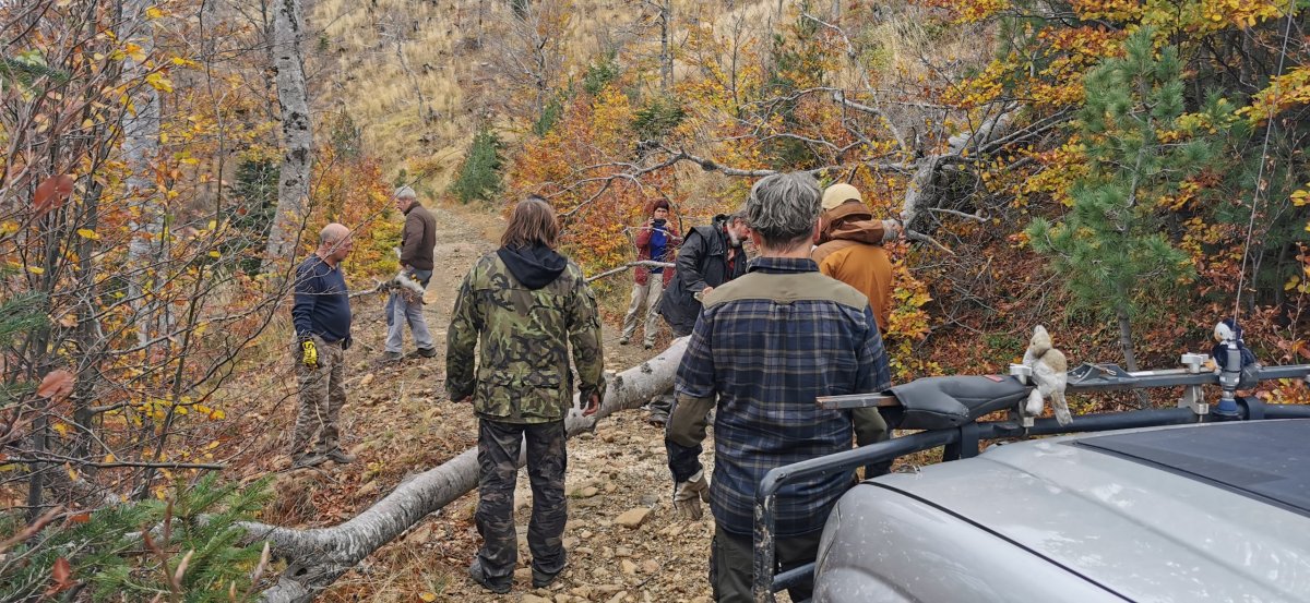 Na cestě děláme krátké přestávky na focení, čůrání nebo oběd. Dnes nás na cestě překvapí i padlý strom, který je nutné rozřezat motorovou pilou ao něco dále obrovský kámen, který nejde objet.