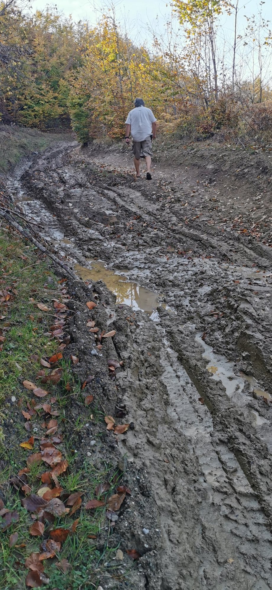 Od pumpy se hrneme hned do terénu, po cestě, kterou nemáme projetou. Je to obtížné stoupání s klesání. Nerovná cesta, spousta kameni, kaluže, úzká, vymletá.