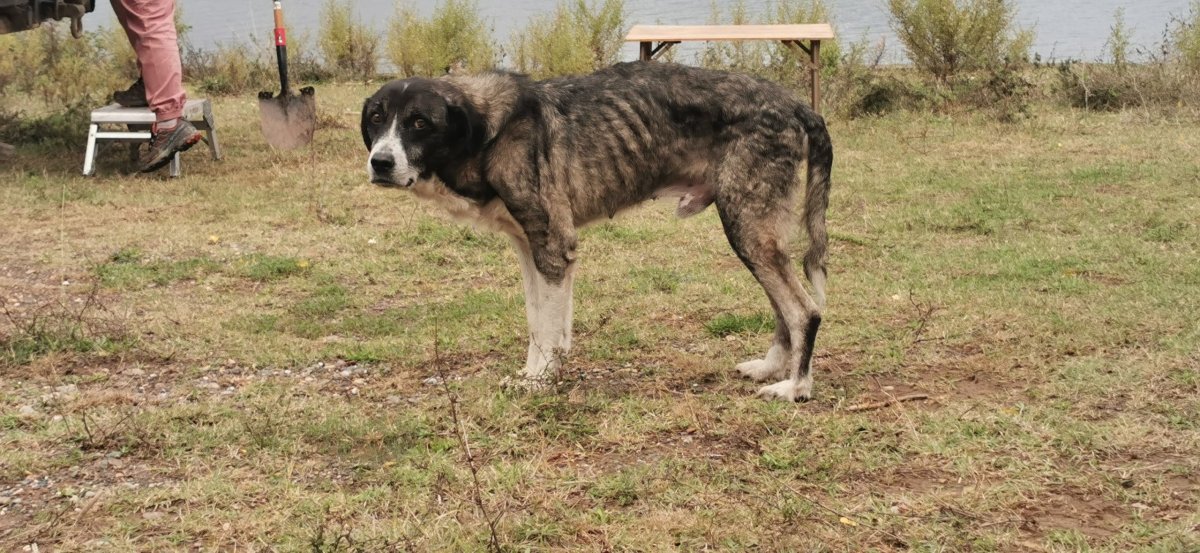 Máme tu v jedné posádce veterináře a ten ho zběžně prohlédne. Pes vypadá dobře, asi 4-5 let, pěkné zuby, vyděšený, podvyživený.