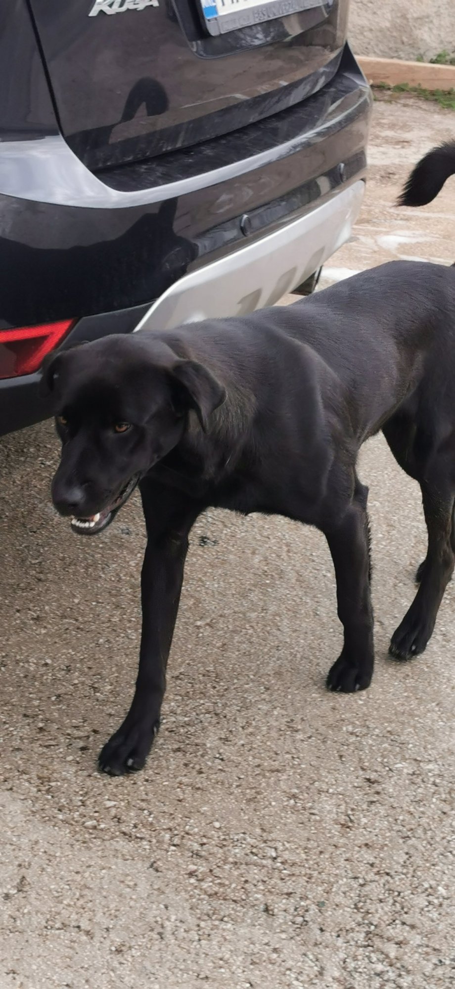 Leží tu štěně labradora. Asi 10kg váhy, není moc hubený, na krásnou černou srst. Je opatrný ale granule si dá rád.