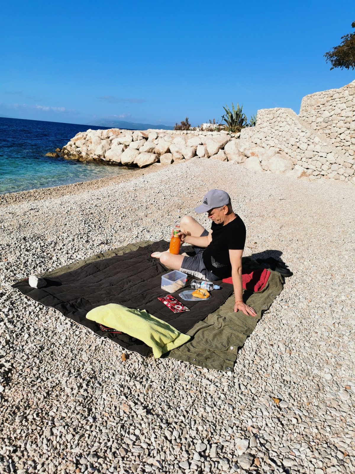 Po 16h přijedeme na místo k moři, kde se dá zastavit přímo u pláže, zdarma. Pláž je zcela prázdná, oblázky, moře čisté a teplé. Hned do něj skočím. Na břehu je každých 50m sprcha. Prostě příjemná očista po cestě. Je 25°C a my se vydáme hledat zmrzlinu ale vše je zavřené, kromě jedné kavárny na pláži. Všude okolo rostou olivovníky.