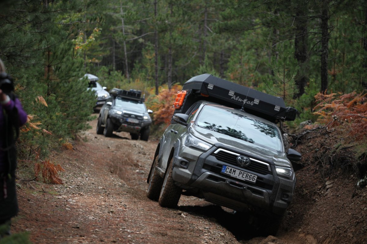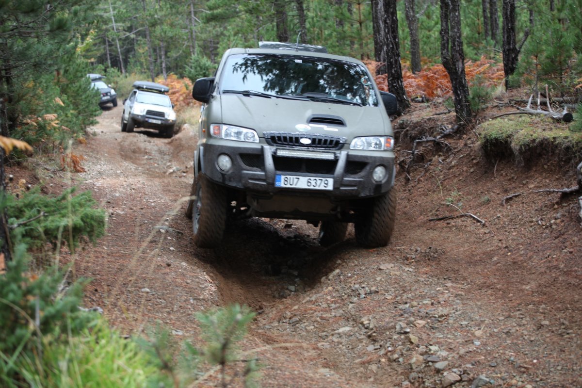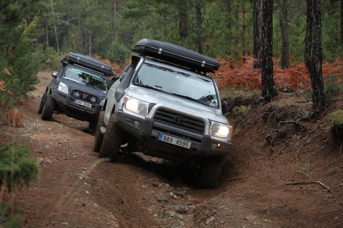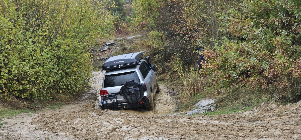 Nováčci jako my poprvé řadí náhon na 4 kola, redukci a snažíme se držet ve stopě vedoucího vozidla.