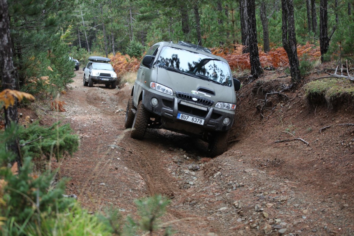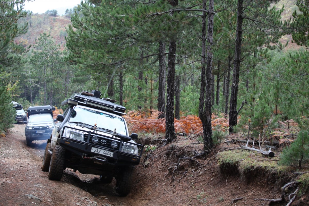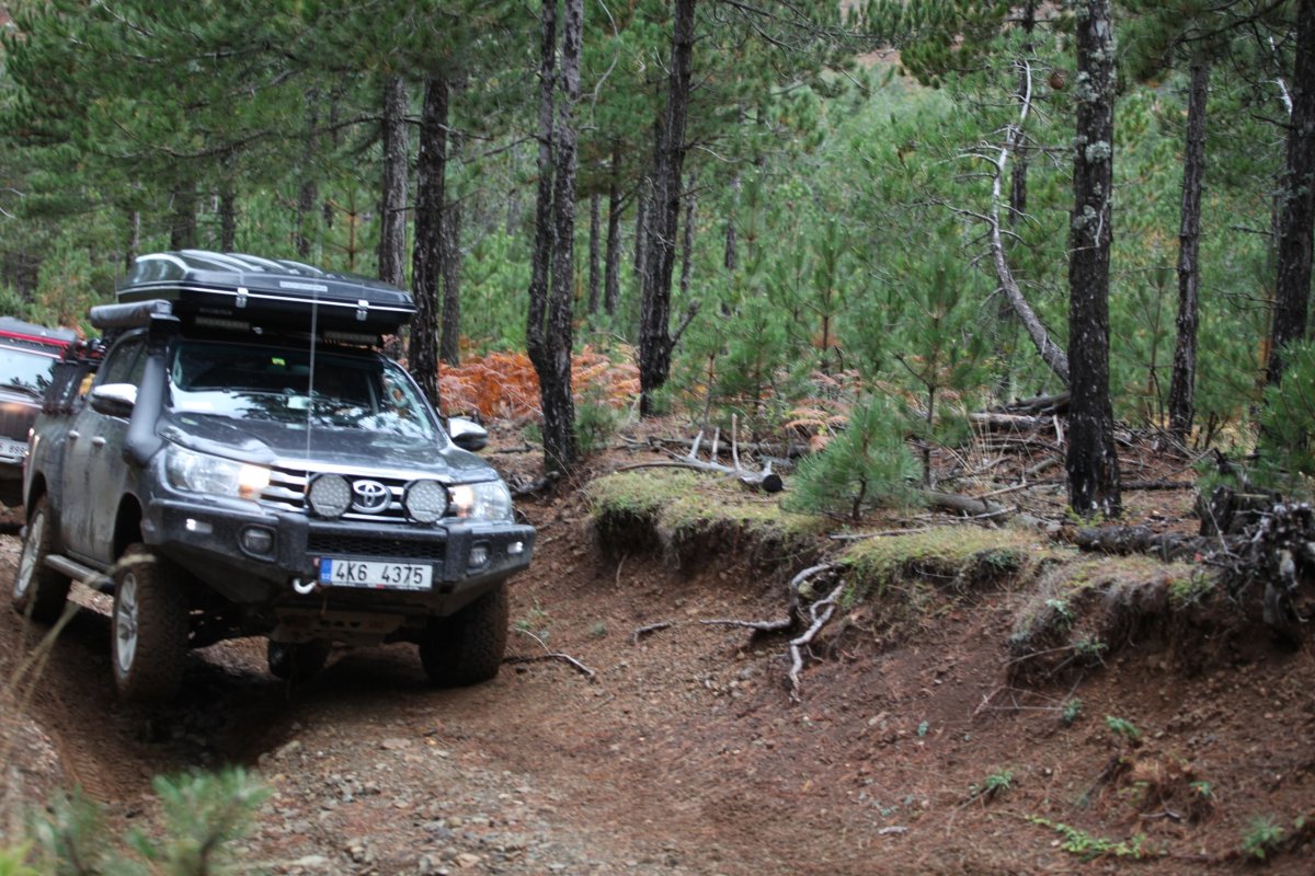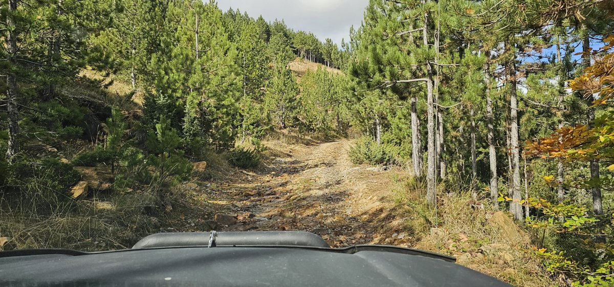 Jedeme. Hned za hotelem zahrneme do hor a tentokrát je cesta úplně jiná. Vede opět mezi borovicemi ale je plná kamení. Po čase zjistíme, že byla asi dříve vydlážděná kameny. Je to cesta na méně než jedno auto a tak nás stále škrábou větve z obou stran. Cesta je strašně hrbolatá, jedeme 10km/h max. Je to náročné na čtení cesty, kam dát kola aby kameny nenarazily zespodu či z boku do auta. Při sjezdu se naučíme používat redukce tak, že ani z největšího kopce s množstvím kamenů nepoužíváme brzdy. To je pro mě úplně nové.