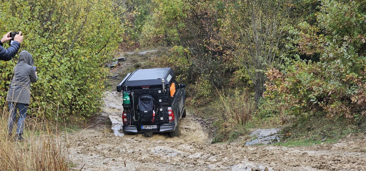 Nejzkušenější borci jdou na průzkum terénu. Zkoumají hloubku kaluží a tvrdost podkladu. Musí projít celou cestu a tak mizí za desátou prohlubní a vrací se za 15 minut. Tváří se, že by se to dalo jet, ale protože je už pozdě, je nebezpečí, že bychom auta tahali z bahna potmě. Také by se mohl narušit příjezd domů, protože jsme ještě daleko.