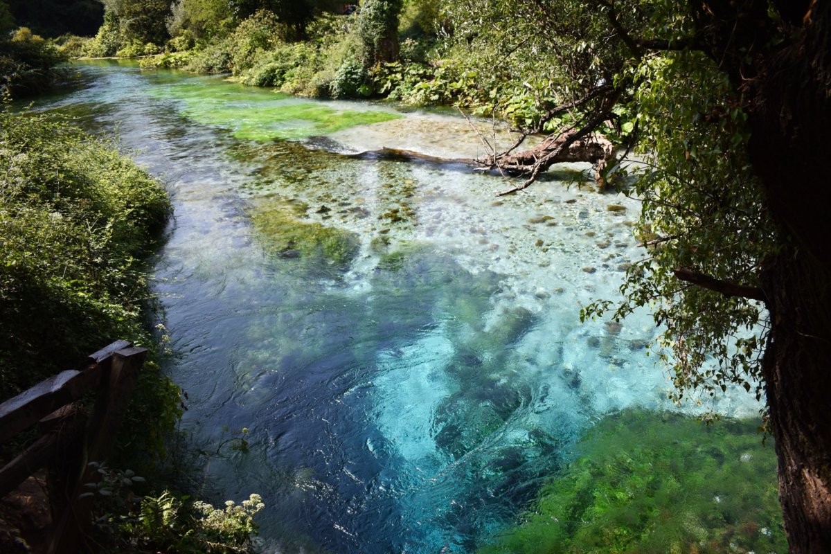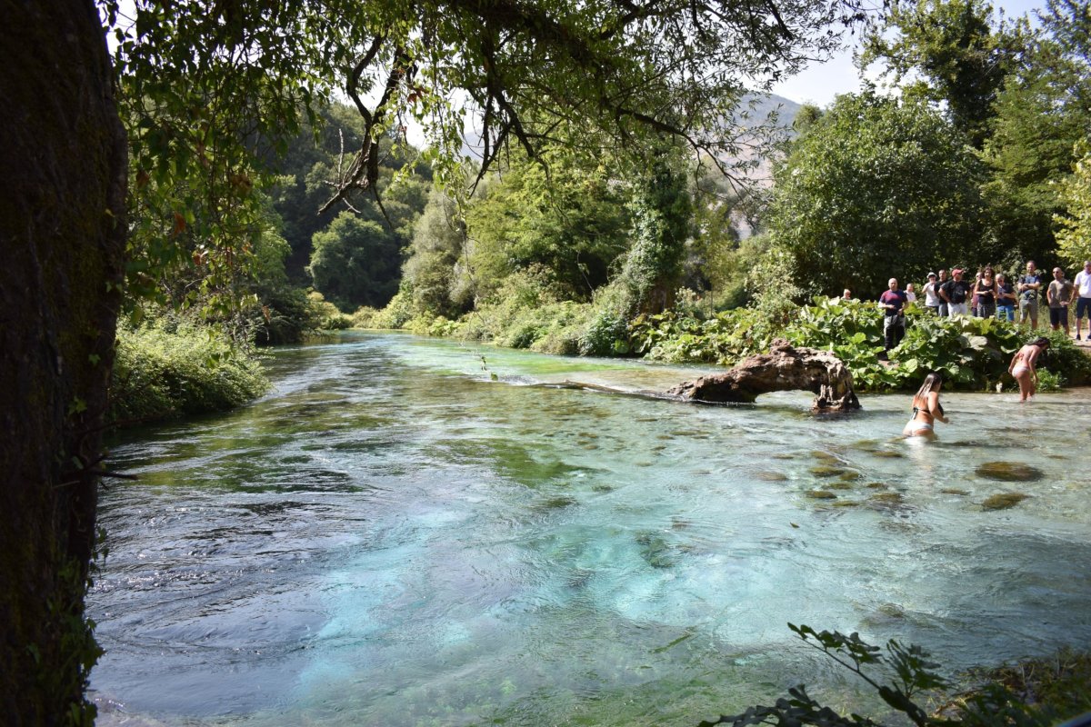 Dost bylo válení se, jedeme na výlet. Pramen Blue eye (modré oko) se nachází půl hodiny cesty ze Sarandy. Cesta je jednoduchá a dobře značená. Jen poslední úsek k parkovišti si užíváme trochu offroad jízdy. Blue eye je krasový pramen, který vyvěrá z hlubiny hory a tvoří na povrchu malé jezírko, odkud voda pokračuje dál říčkou Bistrica. Svůj název má podle kruhového tvaru s barevným oddělením – uprostřed je sytě modrý, u okrajů je do zelena, podobně jako duhovka a zornice. Pokud plánujete např. nocovat v Gjirokasteru (nebo okolí), tak to máte pěkně po cestě a dá se to zvládnout v rámci jednoho dne. V jezírku se oficiálně nesmí koupat, nikdo to ale nekontroluje a zejména turisté z východu to ani náhodou nedodržují. Voda je každopádně i v létě totálně ledová a neskočil bych tam ani za nic. Bohatě mi stačí stoupnout si na kraj, dál nejdu ani náhodou. Odpo jsme již zpět na pláži v Ksamilu.