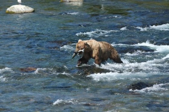 V King Salmone toho veľa okrem pár domčekov nie je a najlepšie je sa tu vôbec nezdržiavať a hneď vyraziť ďalej do Brooks Falls, pokiaľ sa dá. Neodporúčam veľmi kempovať tu len tak niekde na divoko. Skúšali sme to a medveďov je veľa aj tu. Jeden, nie najmenší, prišiel v noci takmer k nášmu stanu a nebola to veľmi príjemná situácia.