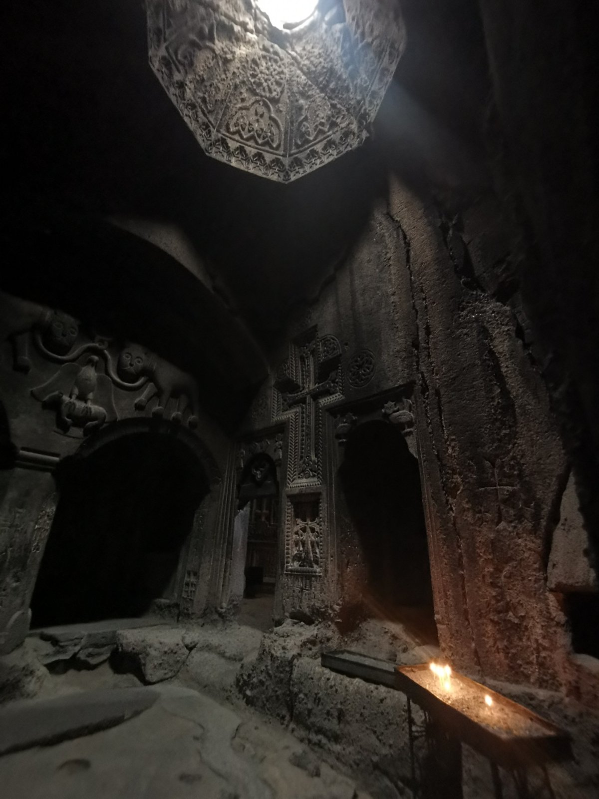 Z Garni do Geghardu jezdí taky maršutka, ale nevím, jestli zajíždí až tam nebo jen do nejbližší vesnice. My jsme vzali taxíka, kterých je všude dost v krásných oprejskaných Ladách. Jízda do Geghardu byl fakt zážitek. Vyšlo to na cca 150 Kč tam i zpět včetně cca hodinového čekání na nás před klášterem. Je potřeba znát aspoň pár slov rusky.