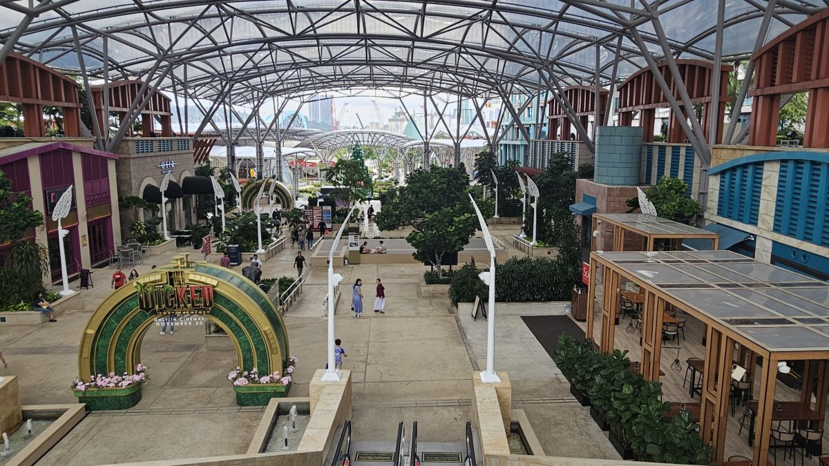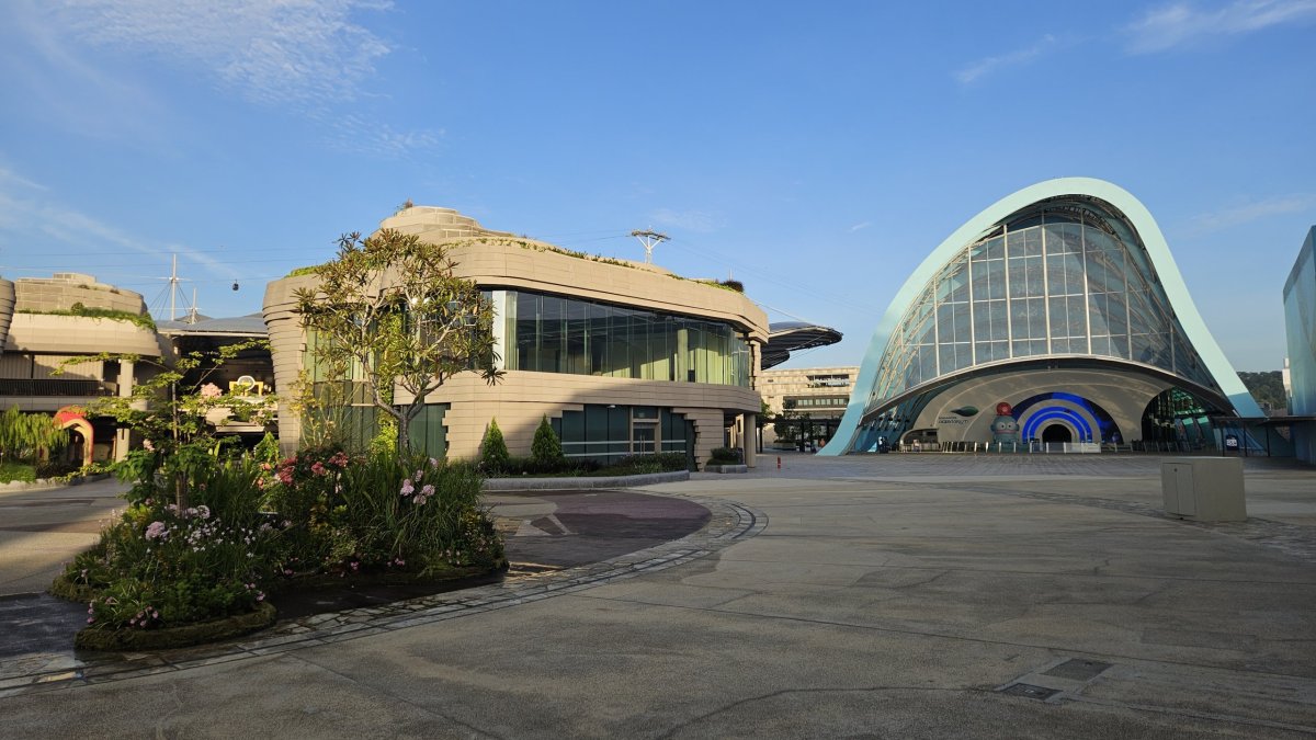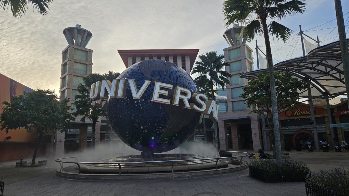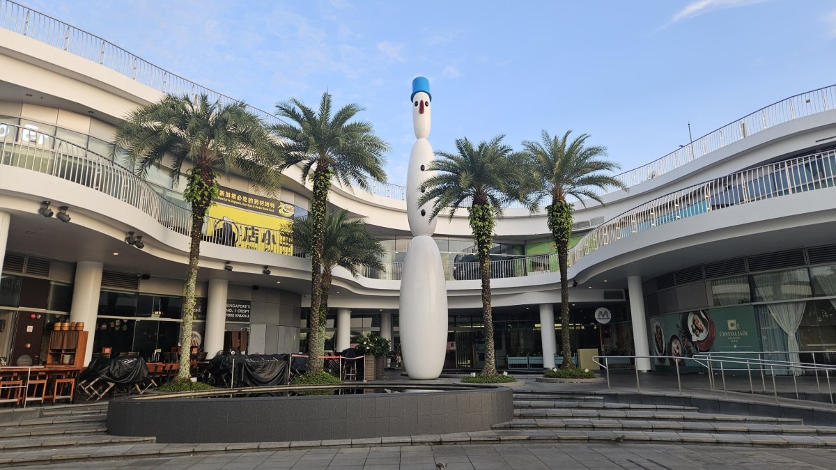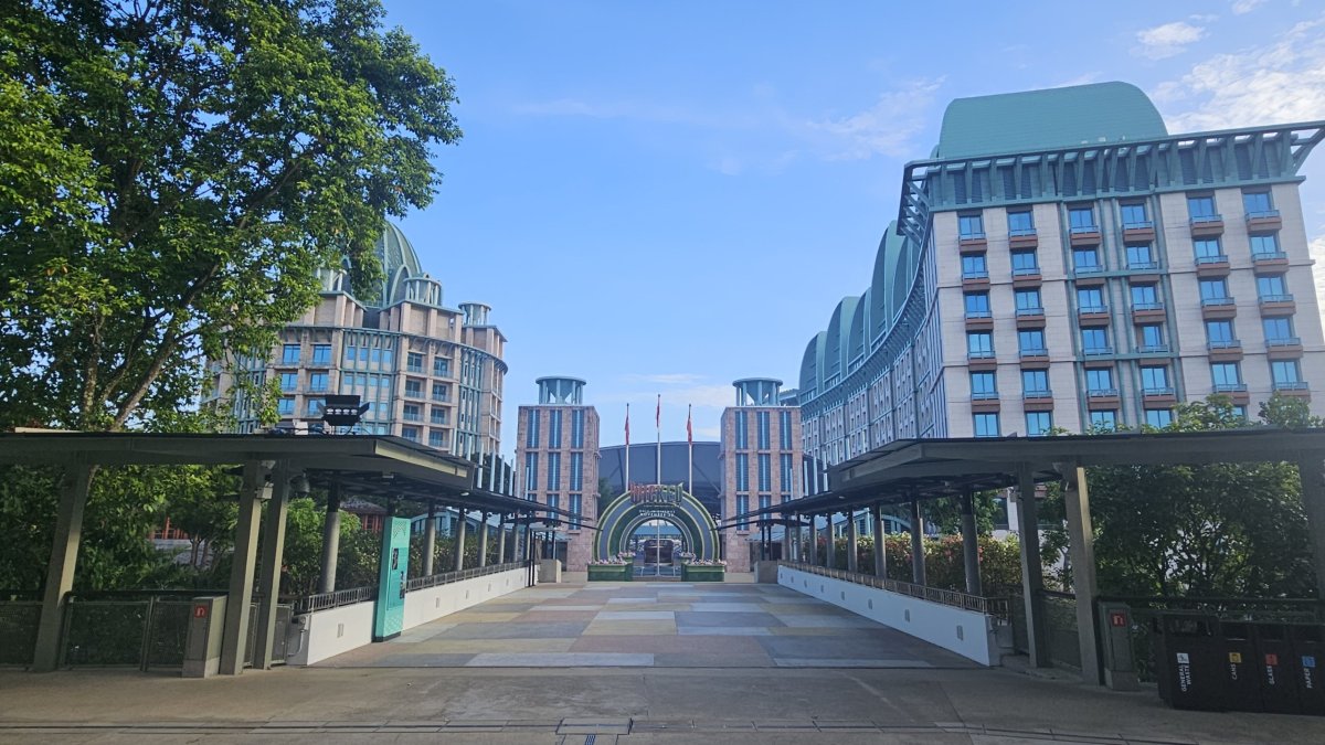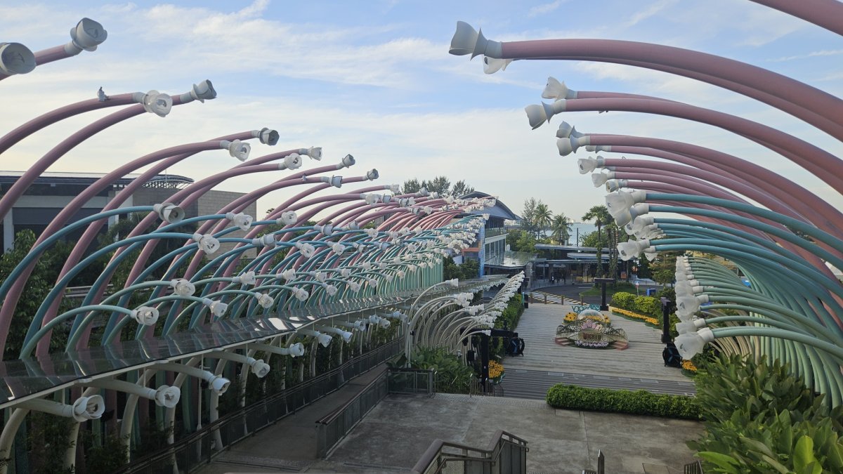 Přes násep jdeme z pevniny na Sentosu, bohužel kvůli stavebním úpravám na kraji ostrova musíme jít okolo šestiproudovky, ráno naštěstí s minimálním povozem, místo kolem moře. A do turistického centra ostrova teď navíc pěší cesta vede přes obrovské podzemní parkoviště. Když z něj vyjdeme na místní centrální „náměstí“, užíváme si zde naprostého klidu a pohody, nikde není pomalu ani noha. My přecházíme až k plážím, kde je takhle brzo ráno jen pár desítek lidí.