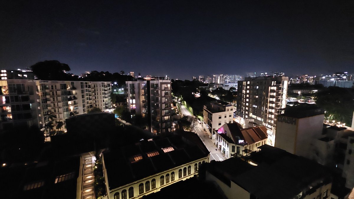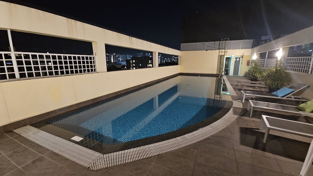 Za to dostáváme kamrlík o rozloze 12m2 včetně koupelny, kde jediným nábytkem mimo postel je malý stolík a plastová židlička a kde lze ve dvou fungovat jen tak, že jeden leží na posteli a to ještě musí být u zdi. Ale bohužel, takové kamrlíky jsou v Singapuru u levného ubytování standard. V podvečer tak vyrážíme kousek do hotelu do nějakého menšího nákupního centra, kde je několik stánků s jídlem. My tu za večeři i s pitím platíme 16 SGD (260 Kč) a po ní míříme na střechu hotelu, kde je bazén a ze dvou stran výhled na noční město.