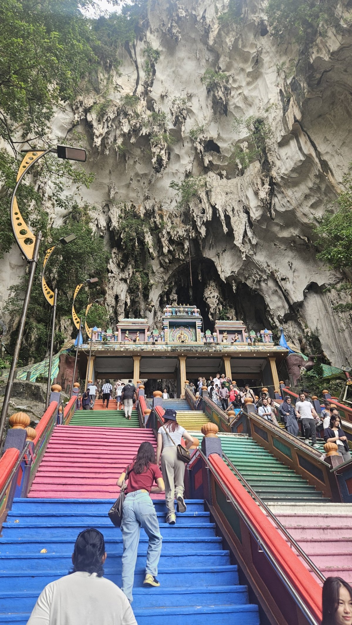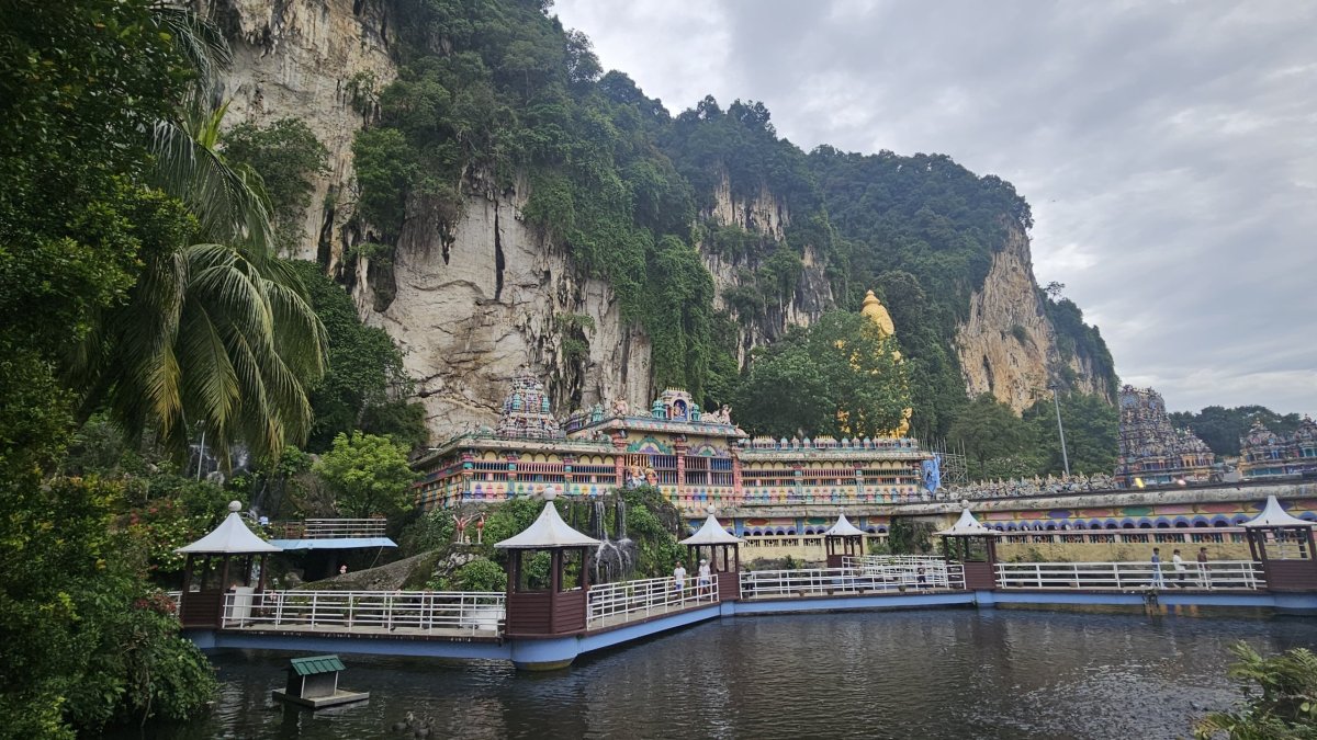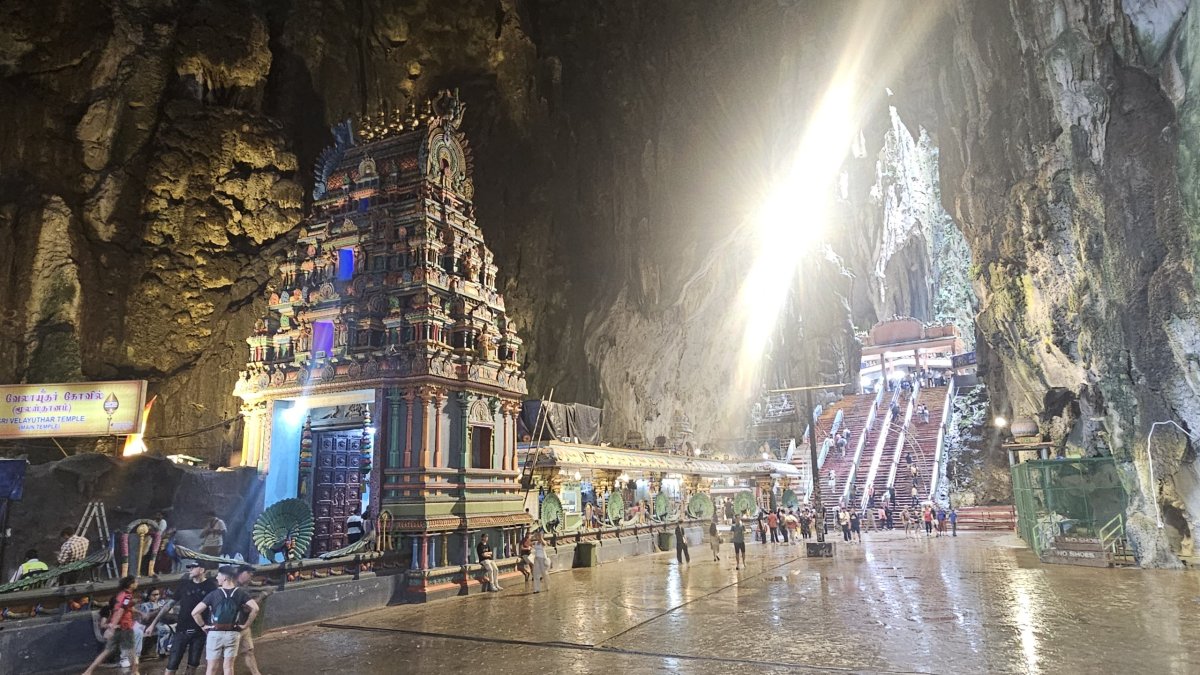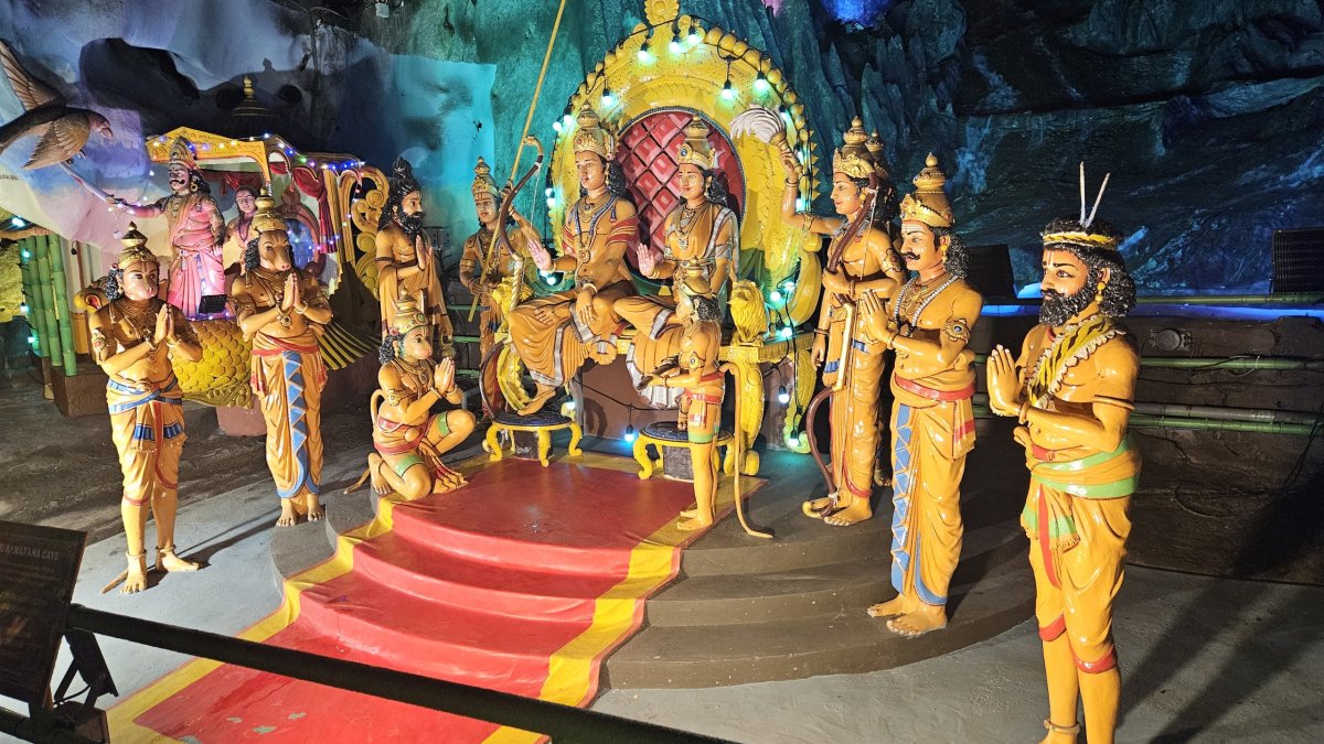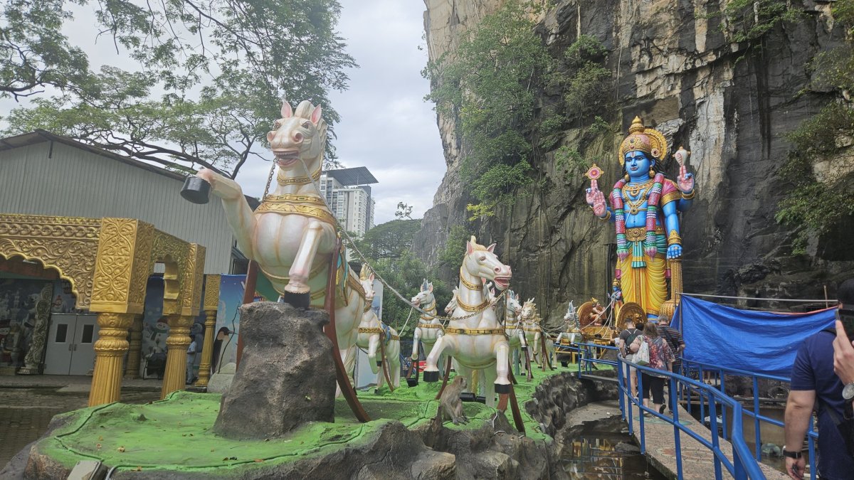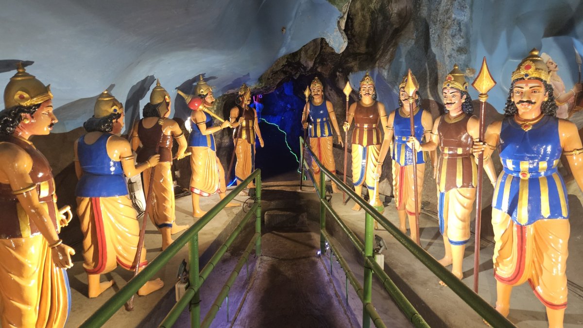 Vlak, solidně zaplněný, má na nádraží u Batu Caves konečnou, a to jen pár desítek metrů od celého areálu. Vstup je obecně zdarma, ale u vchodu zřízenci dle nějakého nejasného klíče posílají lidi dvěma směry. My jsme posláni nejprve doleva, kde je za poplatek 15 MYR (75 Kč) přístupná soustava (ve zdejším měřítku) menších jeskyní Ramayana Cave, ve kterých jsou stovky všemožných barevných soch v životní velikosti, které zobrazují výjevy z hinduistické mytologie. Tento menší komplex jeskyní je propojen velmi příkrými betonovými schodišti a projít si jej je skutečně zážitek, protože podzemní prostory jsou impozantní.