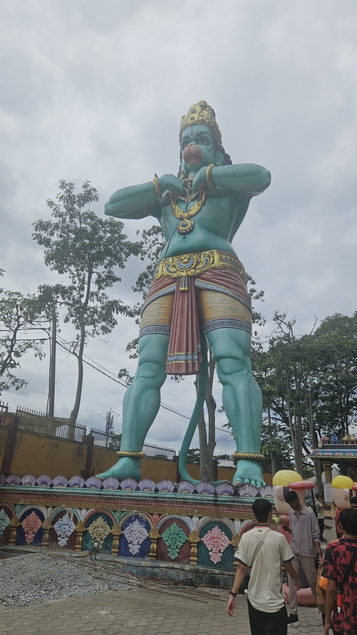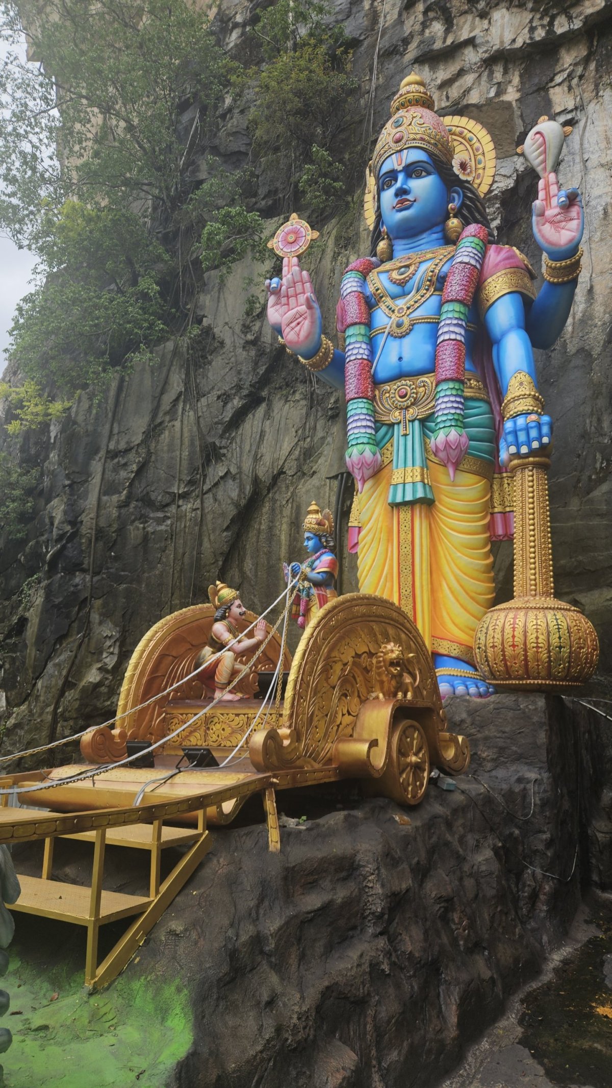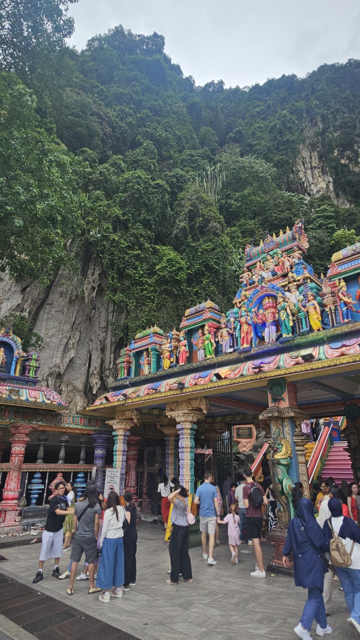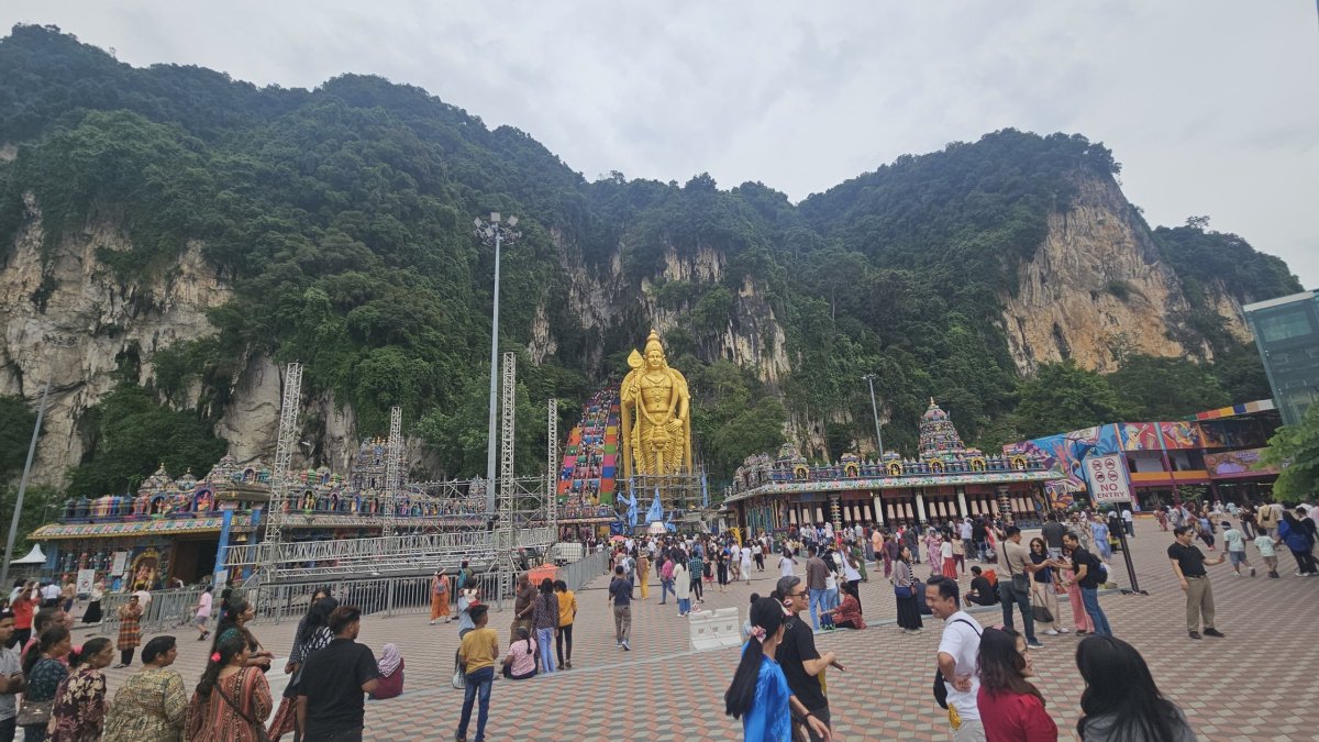 Vlak, solidně zaplněný, má na nádraží u Batu Caves konečnou, a to jen pár desítek metrů od celého areálu. Vstup je obecně zdarma, ale u vchodu zřízenci dle nějakého nejasného klíče posílají lidi dvěma směry. My jsme posláni nejprve doleva, kde je za poplatek 15 MYR (75 Kč) přístupná soustava (ve zdejším měřítku) menších jeskyní Ramayana Cave, ve kterých jsou stovky všemožných barevných soch v životní velikosti, které zobrazují výjevy z hinduistické mytologie. Tento menší komplex jeskyní je propojen velmi příkrými betonovými schodišti a projít si jej je skutečně zážitek, protože podzemní prostory jsou impozantní.